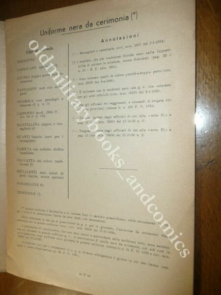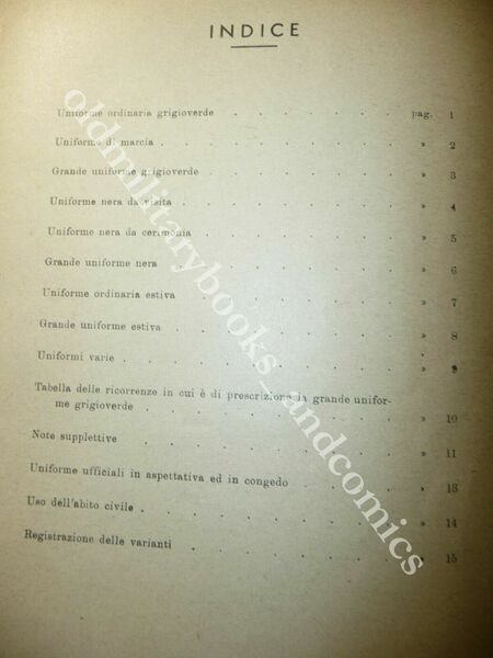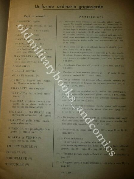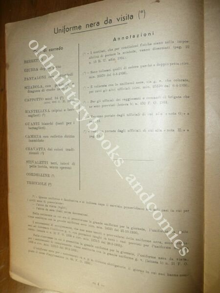 TITOLO: VARIE SPECIE DI UNIFORMI PER GLI UFFICIALI DEL R. ESERCITO (ESCLUSI QUELLI DEI CARABINIERI REALI) DESCRIZIONE: Tip. Fiorenza Firenze 1937, br. ed., pp. 15 in 8°. Il vol. prende in considerazione tutti i tipi di uniformi in uso all'anno 1937, e ne fornisce descrizione completa, purtoppo non ci sono disegni, ma rimane sempre un bel vol. per chi si interessa di uniformologia, come da foto. CONDIZIONI: Buone leggermento sporco. PESO / WEIGHT: 100 gr. without package
