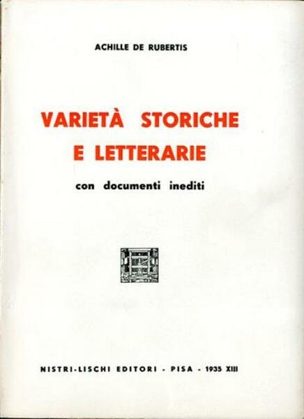 VI, 512 p. ; 22 x 16 cm. L’Autore, animatore paziente di carte d’Archivio, ha scritto una preziosa guida per gli studiosi storici. Vi sono nel libro, pagine interessanti sulla storia, politica e letteraria d’Italia dalla fine del ‘700 alla fine dell’800, particolari documenti inediti che si riferiscono alla vita artistica e letteraria delle città toscane ed ai rapporti fra la toscana e Roma nel 1500 e nel 1600. Capitoli sull'opere letterarie e storiche di Alessandro Allori, Pietro Metastasio, Vittorio Alfieri, Lorenzo Cannelli, G.B. Niccolini, Atto Vannucci, Antonio Rosmini e Orazio Grandi. Brossura editoriale, coperta in cartoncino flessibile con impresso il titolo in rosso al piatto e in nero al dorso. Libro intonso. Codice libreria 8059.