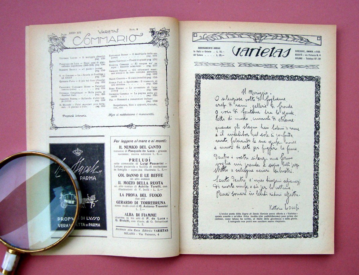 Rivista, Varietas" Rivista Mensile Illustrata Anno XIX N. 8 Agosto 1922 Soc. Ed. Sonzogno; Milano, 1910, cm. 24x17; pag. da 1239 a pag 1300, numerose ill. in b/n nel. t. e fuori. t., inserzioni pubblicitarie d'epoca in b/n; brossura ed. Bella copertina originale ill. a colori. Numero completo. Condizioni di conservazione Esemplare in buone condizioni con tracce d'uso e del tempo; dorso con strappetti e piccole mancanze; interni con bruniture ma buoni. Numero completo RVS001N00769 blu "