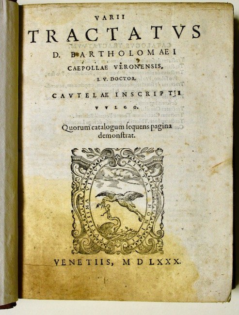 In 8° (202x150) carte n.n. 43, una carta bianca, carte num. 353. Testo latino su due colonne. Marca editoriale al frontespizio, capilettera istoriati. Mezza pelle settecentesca con piccoli angoli, piatti con carta spruzzata verde, titolo su tassello in oro al dorso. <BR>Questa edizione è una ristampa dell'edizione di Monelli del 1571.<BR>Cipolla (1420-1475 ca.), giureconsulto veronese, studiò diritto prima allUniversità di Bologna sotto Angelo da Arezzo e Paolo di Castro, poi in quella di Padova, dove approfondì la conoscenza del diritto civile, canonico e feudale, ottenendo la laurea nel 1445. Iniziò allora la sua attività di docente prima nello studio di Ferrara nel 1449-1450 poi a Verona, dove collaborò alla redazione degli statuti cittadini e dove svolse attività di consulente, avvocato e giudice. A Padova nel 1458 fu iscritto nel Collegio dei dottori giuristi e venne nominato professore ordinario di diritto canonico; dal 1461 fino alla morte tenne, sempre nelle studio padovano, una cattedra di diritto civile e dal 1474 fu il titolare della prima cattedra di diritto civile. Il "Tractatus" ebbero una straordinaria fortuna editoriale, come la maggior parte delle opere del Cipolla, infatti l'opera fu pubblicata in più edizioni sia durante la vita dell'autore (cosa inconsueta nel Quattrocento, epoca nascente per l'industria editoriale) che nel corso dei secoli successivi fino ad arrivare all'Ottocento. <BR>Buon esemplare complessivamente sebbene presenti un alone; alcuni quaderni arrossati e traccia di tarlo al margine inf. Leggere tracce d'uso ala legatura. Carte 139 e 140 invertite. Alcune note antiche al margine inferiore. Non in Sapori. <BR>
