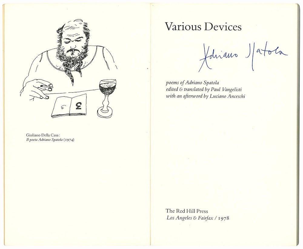 Various Devices. Poems of Adriano Spatola edited & translated by Paul Vangelisti with an afterword by Luciano Anceschi.