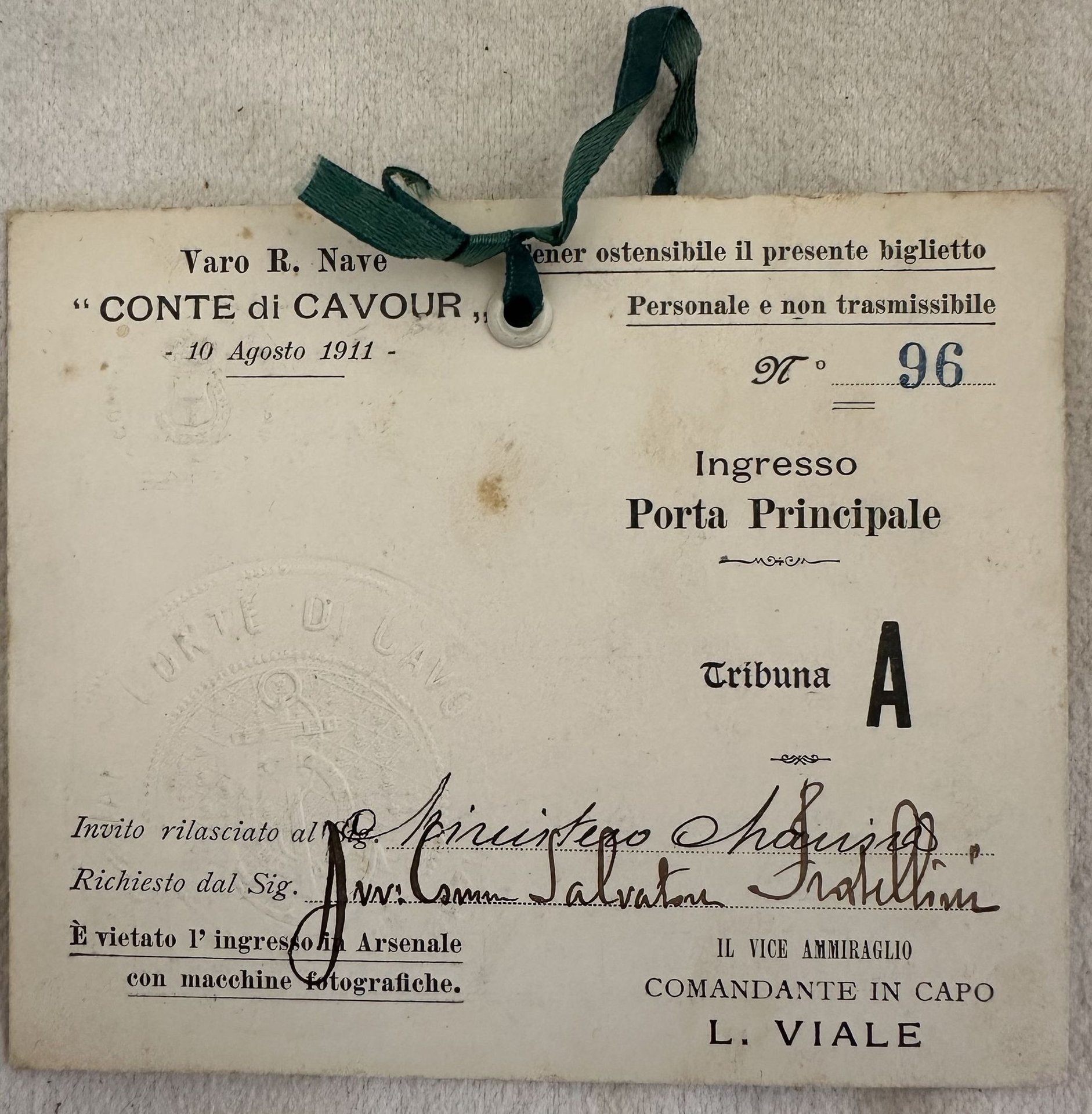 VARO R. NAVE "CONTE DI CAVOUR" 10 AGOSTO 1911 INVITO RILASCIATO AL MINISTERO MARINA RICHIESTO DAL SIG. AVV. COMM. SALVATORE FRATELLINI