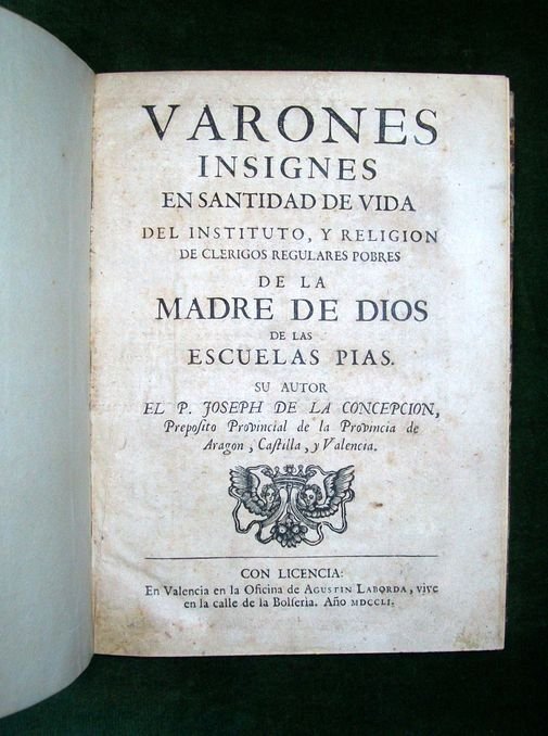 In 4°, pp. (38), 464, (6). Tavola incisa fuori testo con il ritratto di S. Giuseppe Calasanzio. Testatine e finalini incisi. Testo su due colonne. Mezza pelle del XIX secolo. Dorso liscio con titoli e filetti oro.
