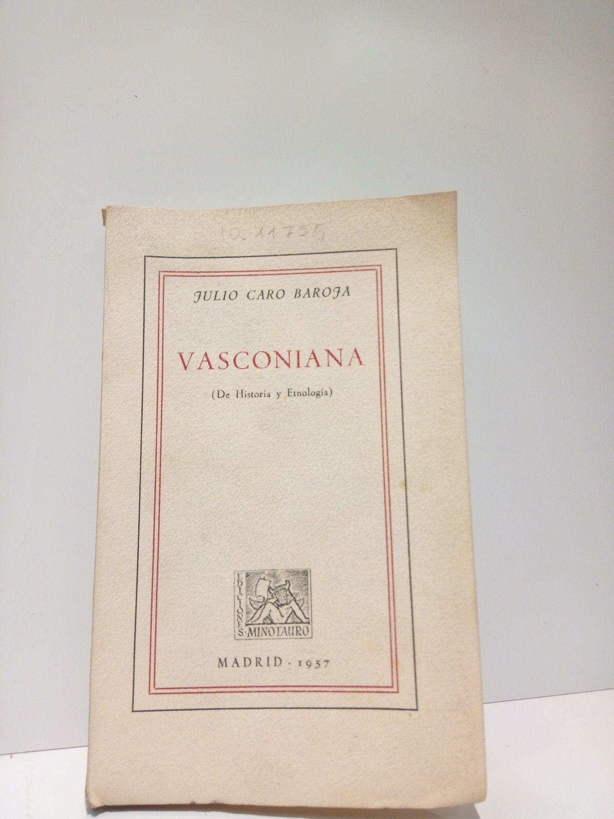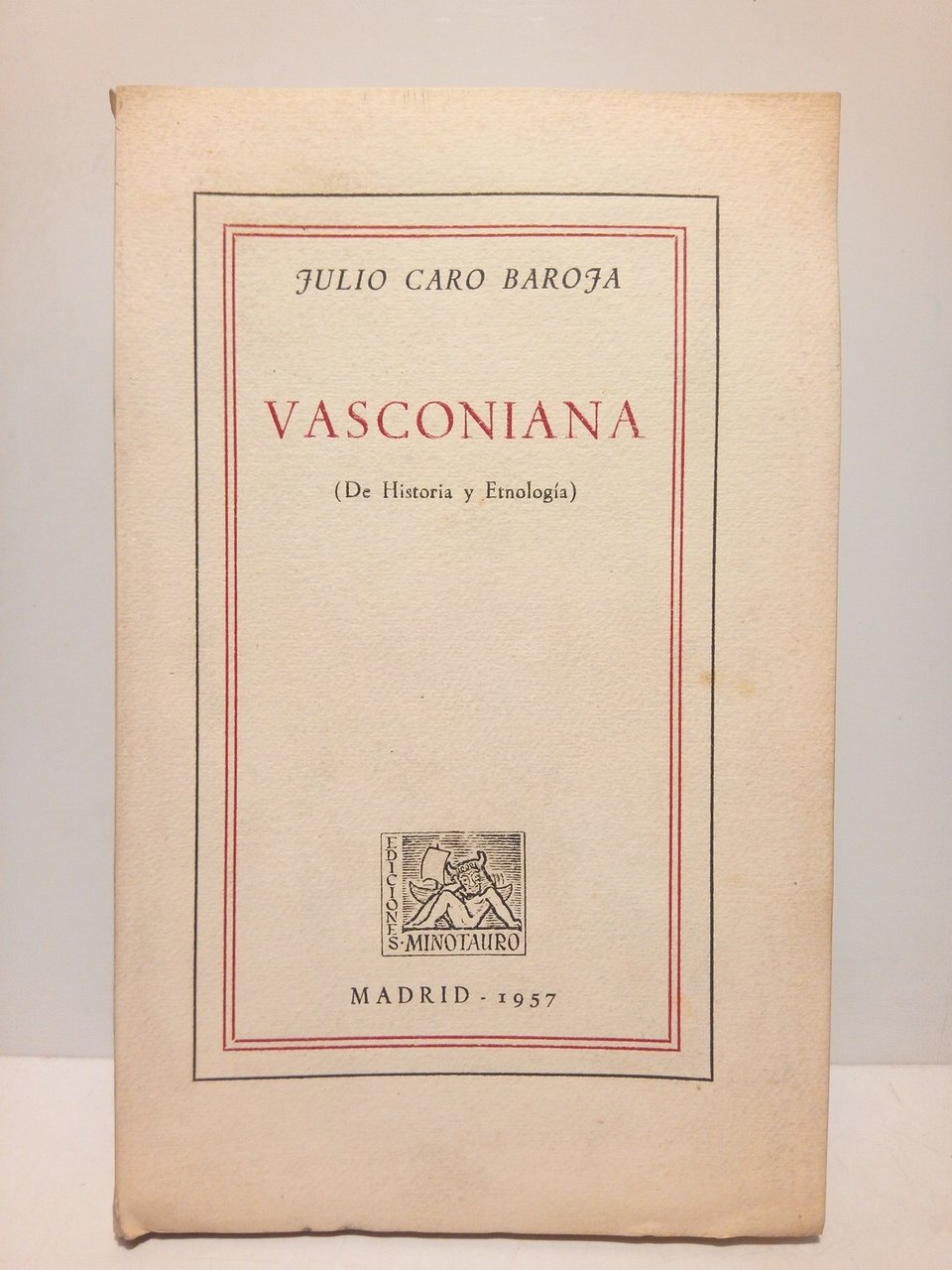 PRIMERA EDICION ESPECIAL LIMITADA.- Madrid: Eds. Minotauro, 1957.- 177 p.: Láminas plegadas al final; 8º mayor (20 x 12,5 cm); Intonso; Cartulina Ed.- (Biblioteca Vasca. 1).- Edición de 350 ejemplares numerados en papel de hilo Guarro, con firma autógrafa original de Caro Baroja a pluma. MUY RARO.* Excelente estado de conservación. PAÍS VASCO