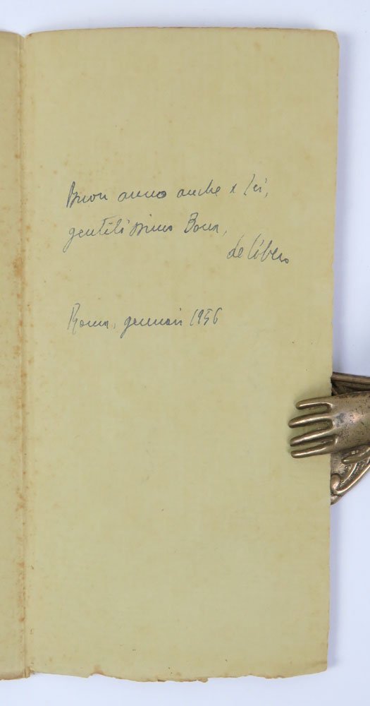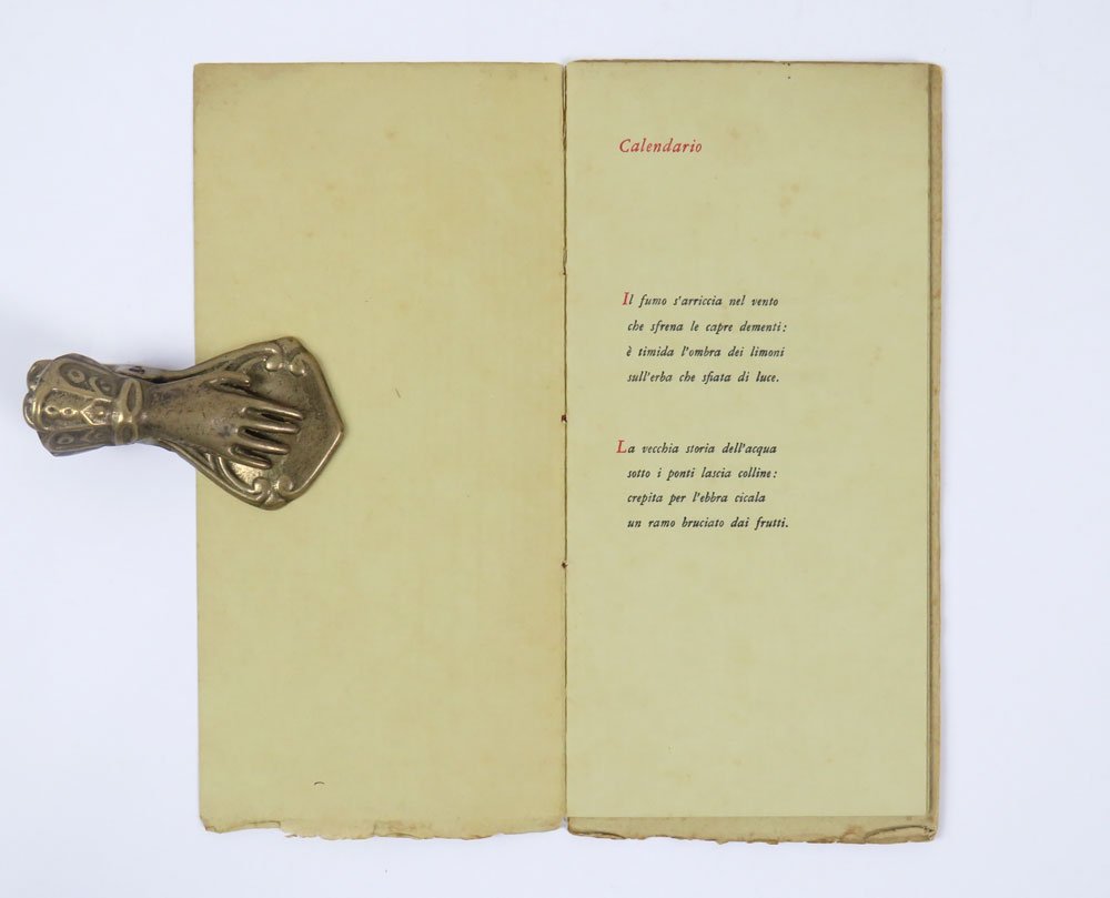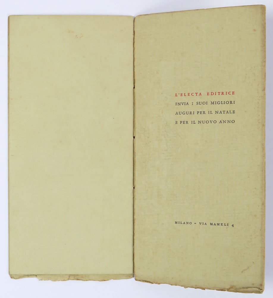 LIBROPrima edizione.Più che buon esemplare, quasi ottimo non fosse per una traccia di sporco al piede della copertina.Rarissima e malnota, datata erroneamente 1952 in alcuni repertori. Deliziosa placchetta fuori commercio impressa a due colori su carta a mano di color beige per conto dell’editore Electa, come strenna 1955/1956. Comprende quattro componimenti: Calendario, Angelus, Omaggio a Seurat, Consigli a un amico innamorato.