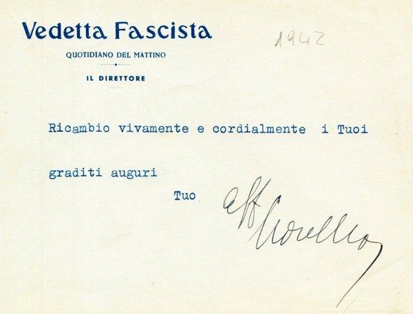 *Vedetta Fascista, quotidiano del mattino di Vicenza. Auguri dei Direttore firmati su biglietto intestato.