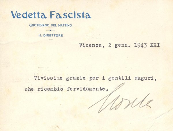 *Vedetta Fascista, quotidiano del mattino di Vicenza. Auguri dei Direttore firmati su biglietto intestato.
