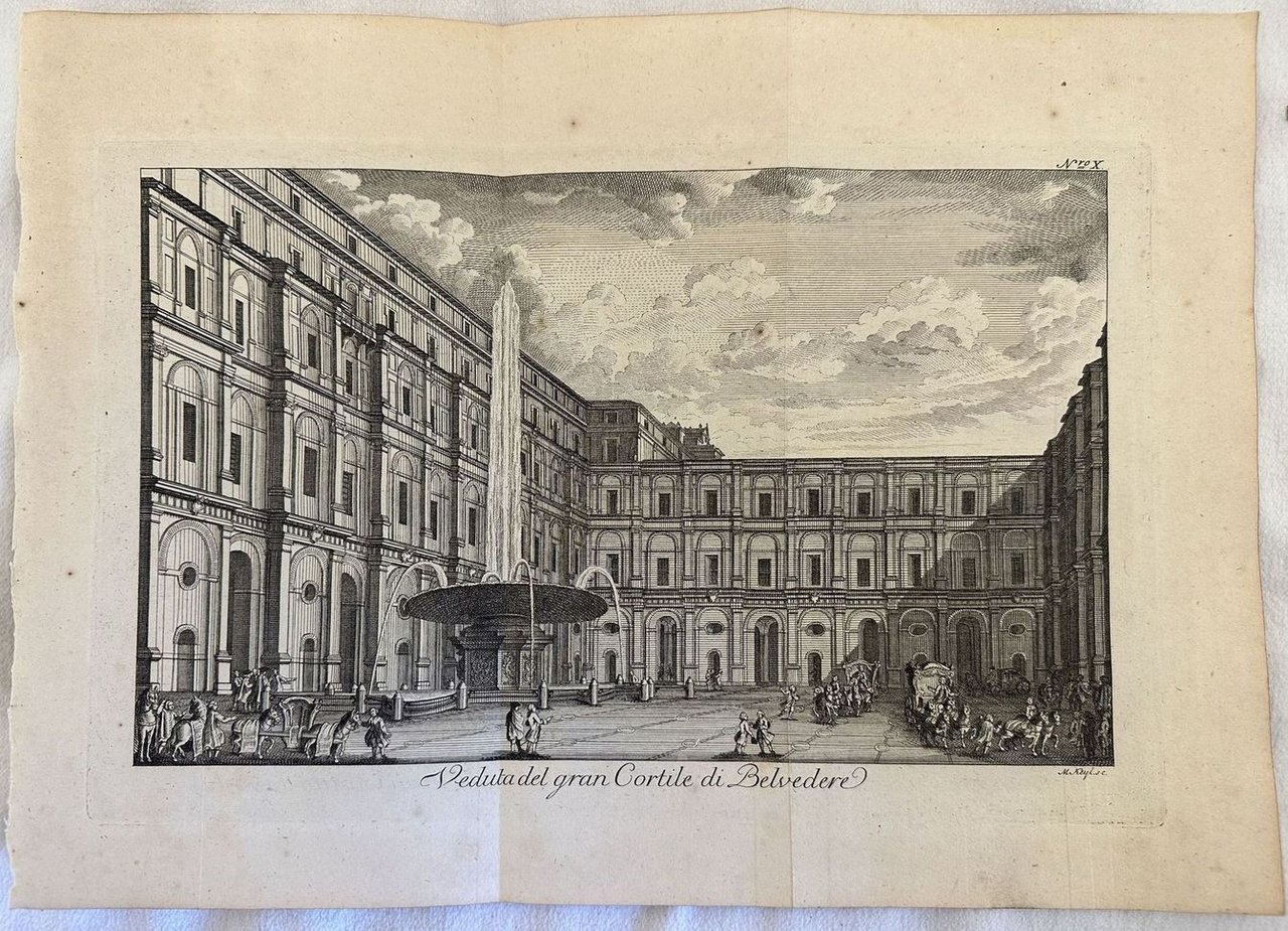Veduta animata del Gran Cortile di Belvedere a Roma di J. Friedrick, fedele riproduzione delle "Vedute di Roma" del Piranesi. Atlante: Briefe uber Rom - Christian Traugott Weinlig Autore: J. C. J. Friedrich Data: 1782 Tecnica: Acquaforte Dimensione del foglio: 370x265 mm Dimensione incisione: 210x315 cm Condizioni: Buone. Rare fioriture. Piegature. An animated view of gate of Belvedere in Rome by J. Friedrick, faithful reproduction of "Vedute di Roma" by Piranesi. Atlas: Briefe uber Rom - Christian Traugott Weinlig Autore: J. C. J. Friedrich Date: 1782 Technique: Etching Leaf Dimension:370x265 mm Engraving Dimension:210x315 cm Conditions: Good conditions. Occasional foxing. Folding.