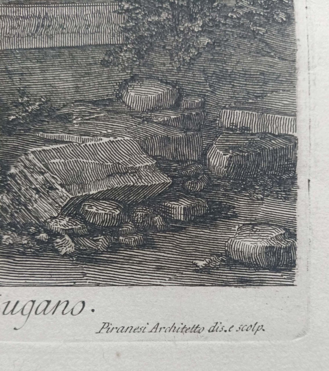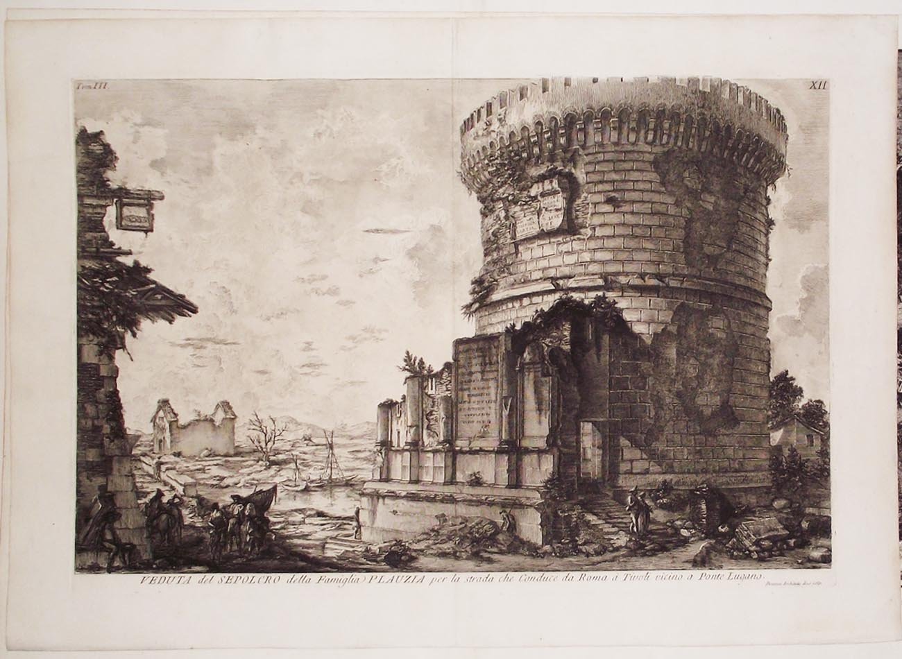 >Acquaforte su rame con interventi a bulino (mm 395x600) .Splendida veduta del sepolcro della famiglia Plauzia, tratta dalla celebre serie di 135 "VEDUTE DI ROMA disegnate ed incise da Giambattista Piranesi Architetto Veneziano" (eseguite dal 1748 al 1778), capolavoro dell'incisione di tutti i tempi.  In alto a destra: 124 XII; in alto a sinistra: Tom. III. In basso: VEDUTA del SEPOLCRO della Famiglia PLAUZIA per la strada che Conduce da Roma à Tivoli vicino a Ponte Lugano. Sotto a destra: Piranesi Architetto dis. e scolp. Buon esemplare a grandi margini, inciso su carta pesante, con filigrana del "giglio in doppio cerchio", Robison p.222. Hind 83; Wilton-Ely 216.