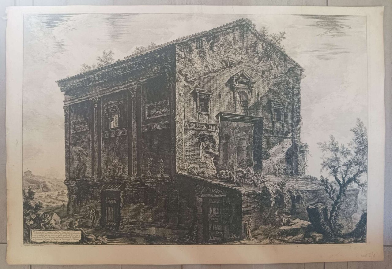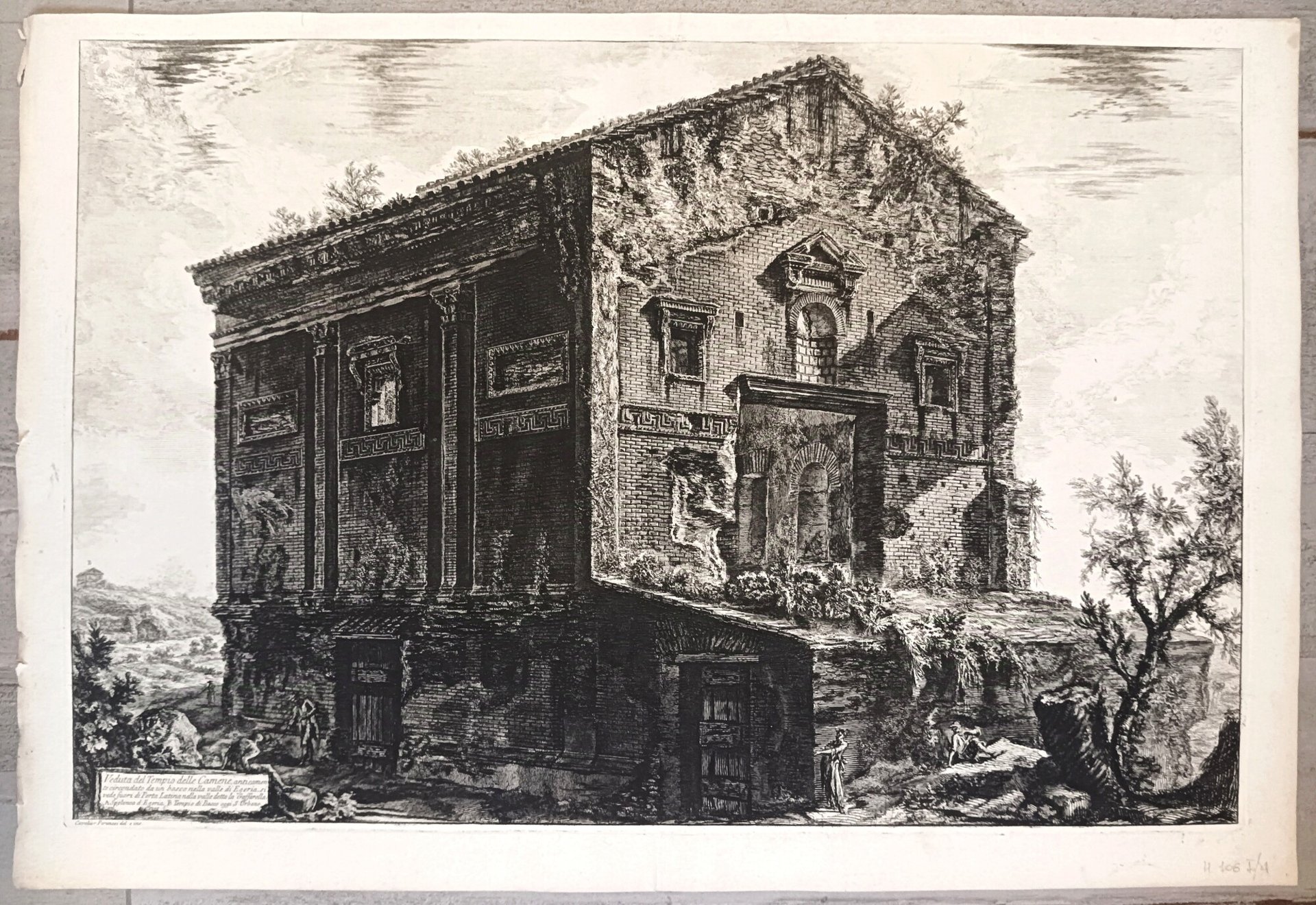 >Acquaforte originale (mm 473x706 e margini), in basso a sinistra entro cartiglio il titolo "Veduta del Tempio delle Camene anticamente circondato da un bosco nella valle di Egeria, si vede suori di Porta Latina nella valle detta la Gaffarella. A Spelonca d'Egeria. B Tempio di Bacco oggi S. Urbano". Firmata in basso a sinistra, "Cavalier Piranesi del. e inc.". Tratta dalla celebre serie di 135 “Vedute di Roma disegnate ed incise da Giambattista Piranesi Architetto Veneziano” (eseguite dal 1748 al 1778), capolavoro dell'incisione di tutti i tempi.