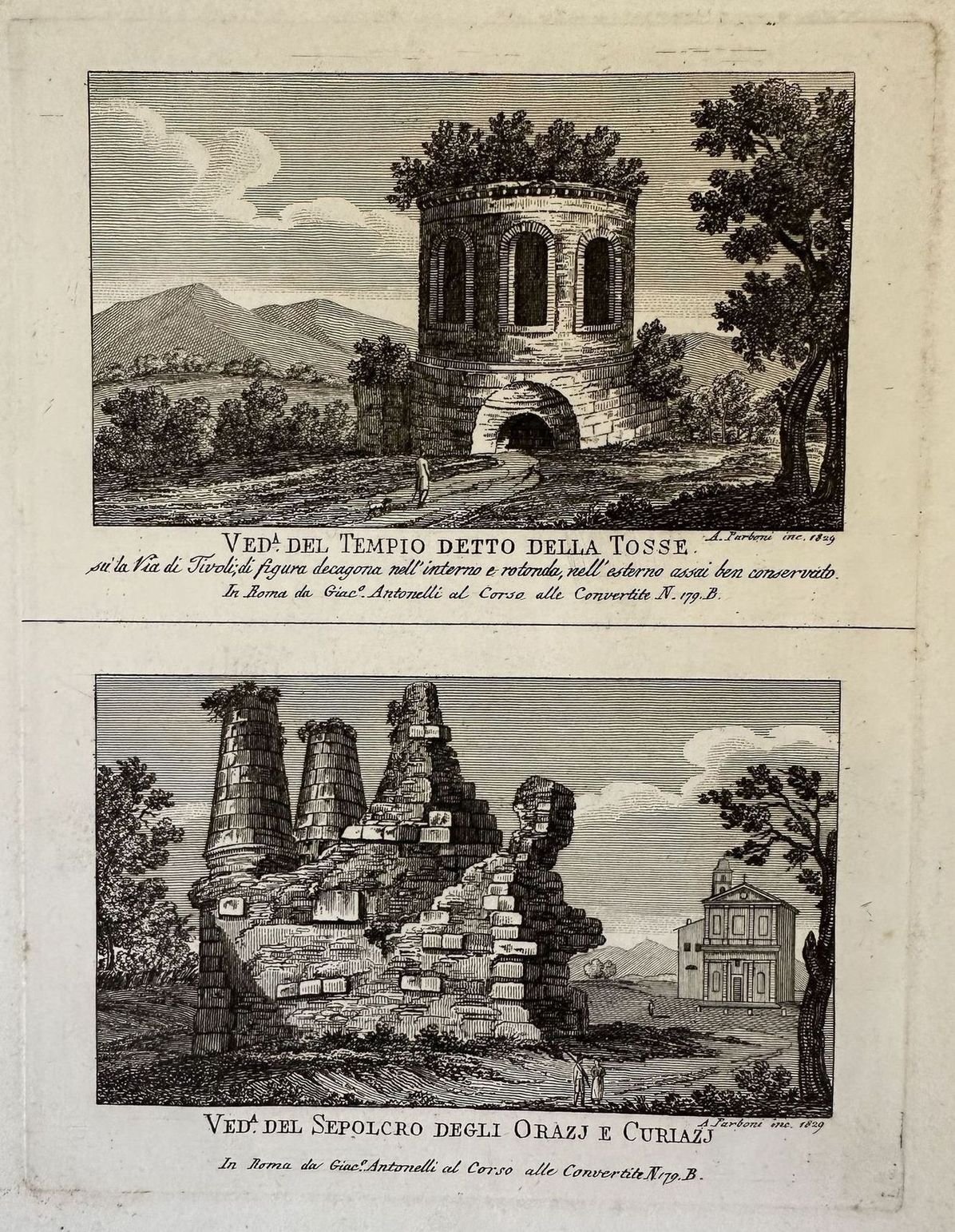 Finissima tavola del 1824, due vedute di Roma incise da Achille Parboni (Roma sec. XVIII-XIX) attivo a Roma, insieme al fratello Pietro, nella prima metà del XIX secolo. La veduta animata mostra i il Tempio della Tosse e Sepolcro degli Orazi e Curiazj. AUTORE: Achille Parboni ATLANTE: Nuova raccolta delle Principali vedute Antiche e moderne dell'alma città di Roma e sue vicinanze EPOCA: 1824 TECNICA: Incisione a bulino DIMENSIONI FOGLIO: cm 25,5x19 DIMENSIONI INCISIONE: cm 17,5x13 CONDIZIONI: OttimeVery fine plate of 1829, two views of Rome engraved by Achille Parboni (Roma sec. XVIII-XIX) active in Rome, together with his brother Pietro, in the first half of XIX century. The animated view shows the Temple della Tosse and the Grave of Orazj e Curazj. AUTHOR: Achille Parboni ATLAS: Nuova raccolta delle Principali vedute Antiche e moderne dell'alma città di ROma e sue vicinanze TECHNIQUE: Burin engraving LEAF DIMENSION: cm 25,5x19 ENGRAVING DIMENSION: cm 17,5x13 DATE: 1829 CONDITIONS: Very good conditions