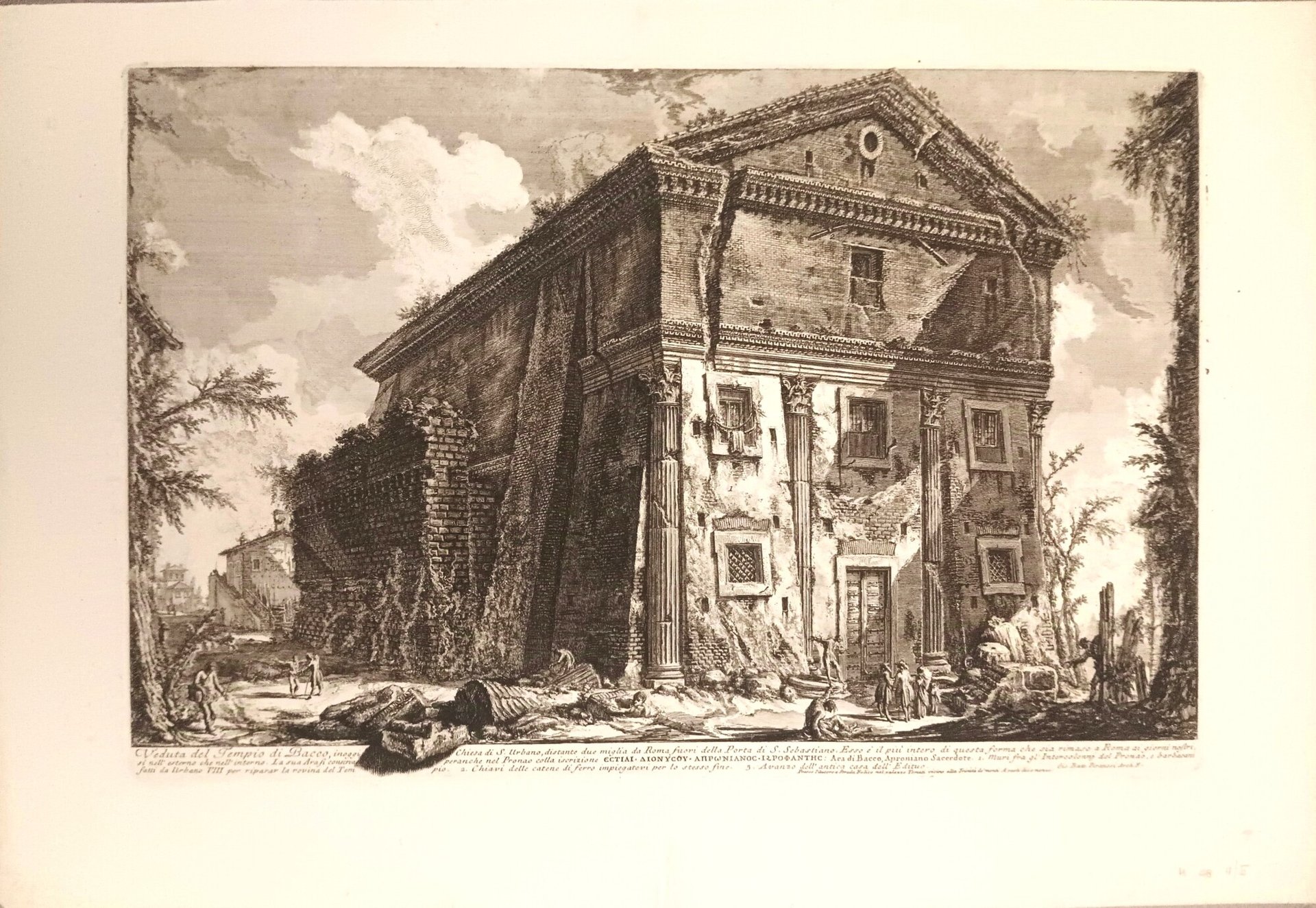 >Acquaforte originale (mm 405x610), con titolo su tre righe posto nella parte inferiore del rame. “Veduta del Tempio di Bacco, inoggi Chiesa di S. Urbano, distante due miglia da Roma fuori della Porta di S. Sebastiano. …1 Muri fra l'intercolennj del Pronao, e barbacani/ fatti da Urbano VIII per riparar la rovina del Tempio. 2 Chiavi delle catene di ferro impiegatevi per lo stesso fine. 3 Avanzo dell'antica casa dell'Edituo” Firmata in basso a destra Gio. Batt. Piranesi Arch F. Presso l'autore a Strada Felice nel Palazzo Tomati vicino alla Trinità de'monti A paoli due e mezzo.”