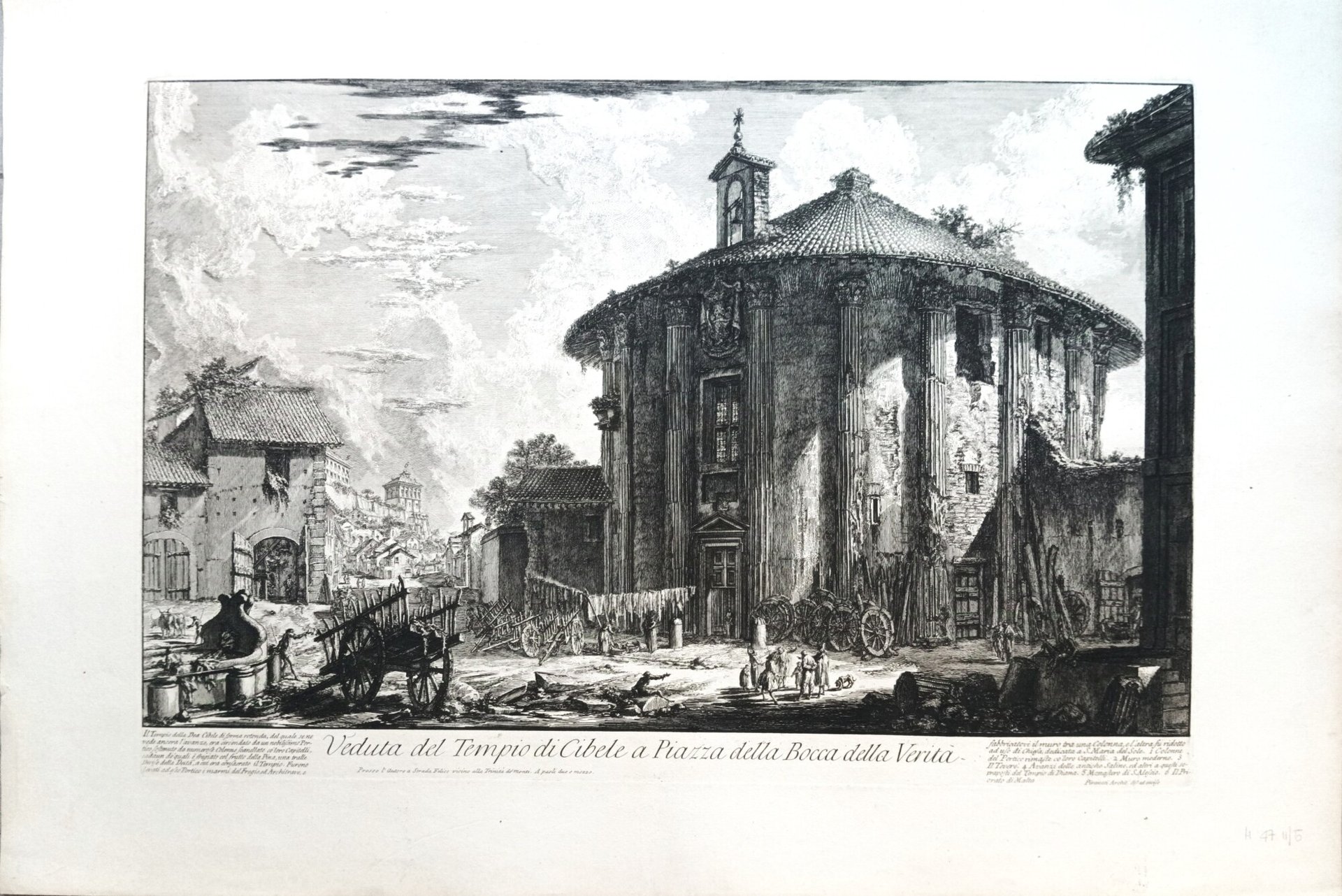 >Acquaforte originale (mm 402x598 e grandi margini), a sinistra e a destra del titolo descrizione della tavola. Firmata in basso a destra"Piranesi Architetto fec." Sotto il titolo si legge: "Presso l'autore a Strada Felice vicino alla Trinità de' monti. A paoli due e mezzo". Secondo stato su cinque. Tratta dalla celebre serie di 135 “Vedute di Roma disegnate ed incise da Giambattista Piranesi Architetto Veneziano” (eseguite dal 1748 al 1778), capolavoro dell'incisione di tutti i tempi. Bell'esemplare impresso su carta pesante vergellata a grandi margini, filigrana "doppio cerchio e giglio", traccia di antica piega centrale.