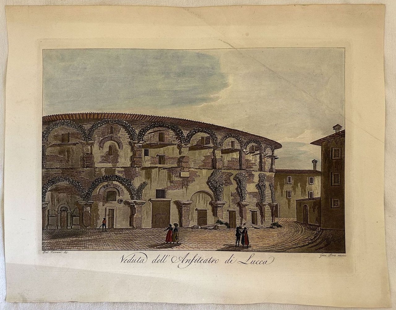 Veduta animata del 1801 dell'Anfiteatro di Lucca. Testo in lingua italiana "Acquatinta, disegnata dal Terreni, del quale si Hanno poche note ma è molto probabile che fosse un parente de Giuseppe Maria Terreni (1739-1811), native of Livorno e attivo a Firenze, celebrato vedutista" (Cfr. Brunet II, 1330; Graesse II, 611) Di grandi dimensioni. Atlante: "Viaggio pittorico della Toscana", Firenze Giuseppe Tofani Autore: Giuseppe Pera su disegno di Antonio Terreni Data: 1801 Tecnica: acquatinta colorata a mano Dimensione del foglio: 425x338 mm Dimensione incisione: 360x265 mm Condizioni: Buone. Rare fioriture.Very fine animated view of 1801 of the Anfiteatro of Lucca. Of big size "Acquatinta, disegnata dal Terreni, del quale si Hanno poche note ma è molto probabile che fosse un parente de Giuseppe Maria Terreni (1739-1811), native of Livorno e attivo a Firenze, celebrato vedutista" (Cfr. Brunet II, 1330; Graesse II, 611) Atlas: "Viaggio pittorico della Toscana", Firenze Giuseppe Tofani Author:Giuseppe Pera after Antonio Terreni Date: 1801 Technique: acquatinct coloured by hand Leaf Dimension: 425x338 mm Engraving Dimension: 360x265 mm Conditions: Good conditions. Occasional foxing.