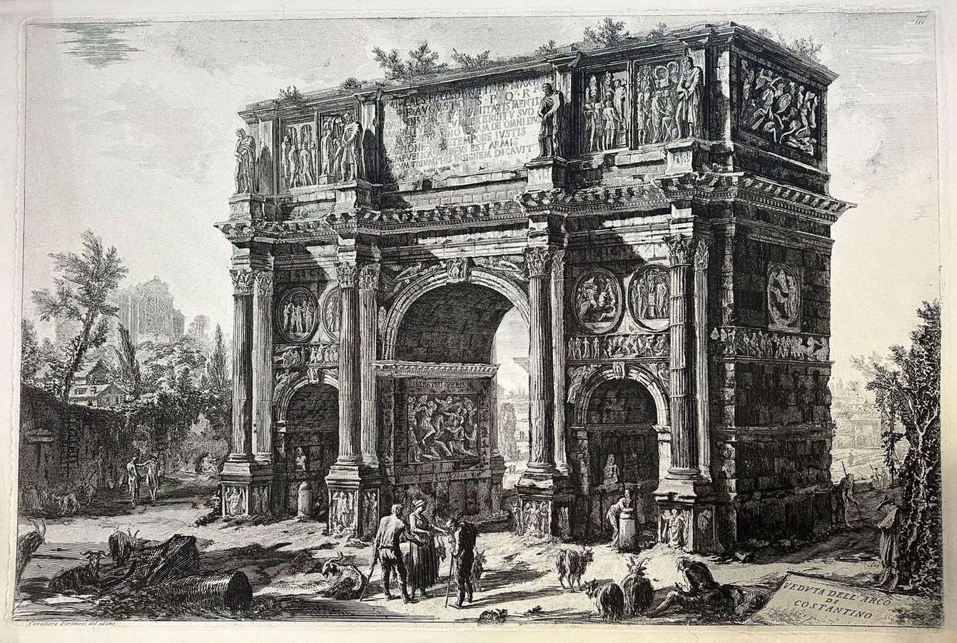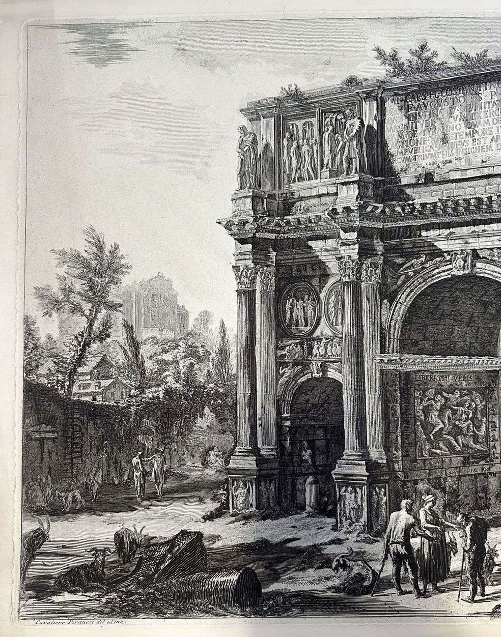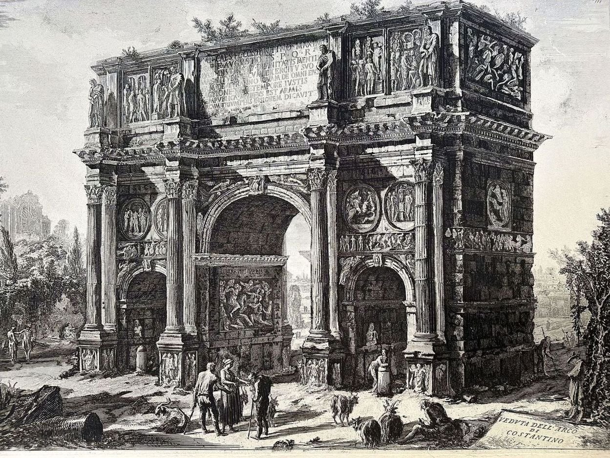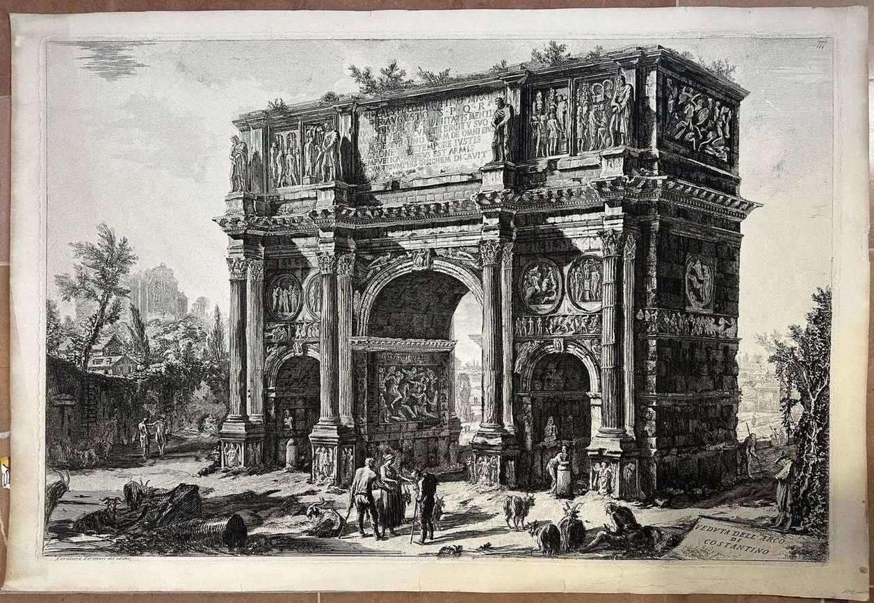 Splendida veduta dell'Arco di Costantino dell'incisore architetto Giovanni Battista Piranesi (1720-1778) del 1770 circa. Veneto di origine, si trasferì a Roma dove, affascinato dalle bellezze della città eterna, iniziò la produzione delle "Vedute di Roma". Autore: Giovanni Battista Piranesi (1720-1778) Data: 1770 circa Tecnica: Acquaforte Dimensione del foglio: 775x525 mm Dimensione incisione: 715x480 mm Condizioni: Buone. Rare fioriture. Strappi marginali tavolta inficianti la parte incisaWonderful view of the Arch of Constantine by the engraver and architect Giovanni Battista Piranesi (1720-1778) of 1770 circa. Piranesi was originated from Veneto and moved to Rome He was so charmed of the beauties of eternal city that decided to produced a series of "Vedute di Roma". Author: Giovanni Battista Piranesi (1720-1778) Date: 1770 circa Technique: etching Leaf Dimension: 775x525 mm Engraving Dimension: 715x480 mm Conditions: Good conditions. Occasional foxing. Tears in the edges sometimes affecting the engraved part<BR><BR>