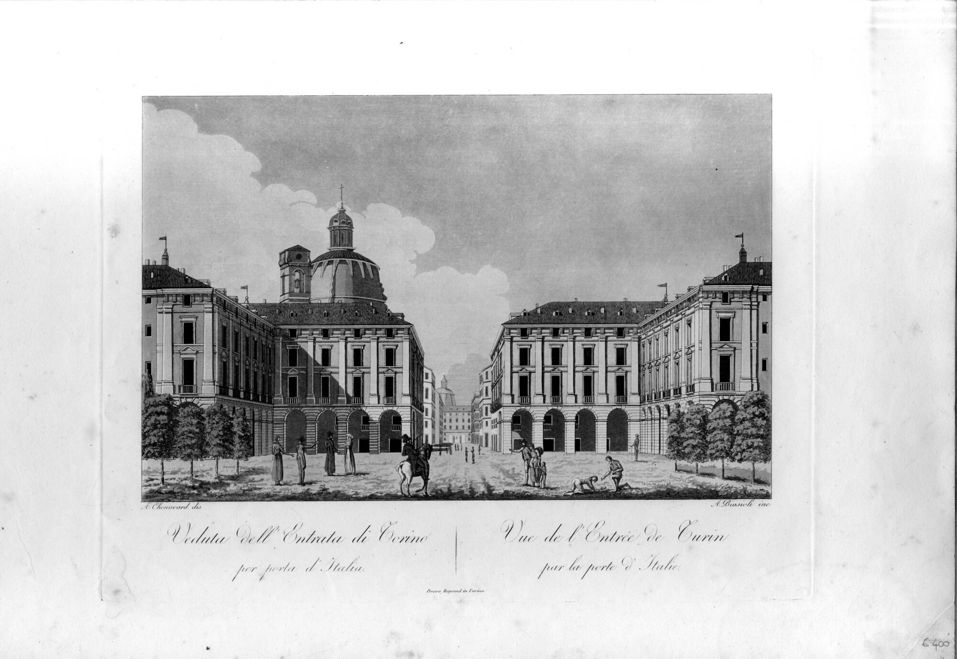 Il titolo della tavola è "Veduta dell'entrata di Torino | per porta d'Italia", ripetuto a destra in francese "Vue del l'Entrée  de Turin | par la Porte d'Italie". Incisione firmata, di A. Biasioli -sopra il titolo a sinistra-, su disegno di A. Chenavard -sopra il titolo a destra-. Centrale, in basso, sotto il titolo: "Presso Reycend in Torino". "Veduta prospettica della via d'Italia (attuale via Milano) dalla piazza Emanuele Filiberto (attuale piazza della Repubblica), con animazione di personaggi in primo piano. Sullo sfondo non appare più, come nelle precedenti vedute, la guglia della Torre Civica, demolita dai francesi nel 1801" (Peyrot, 1, p. 410).