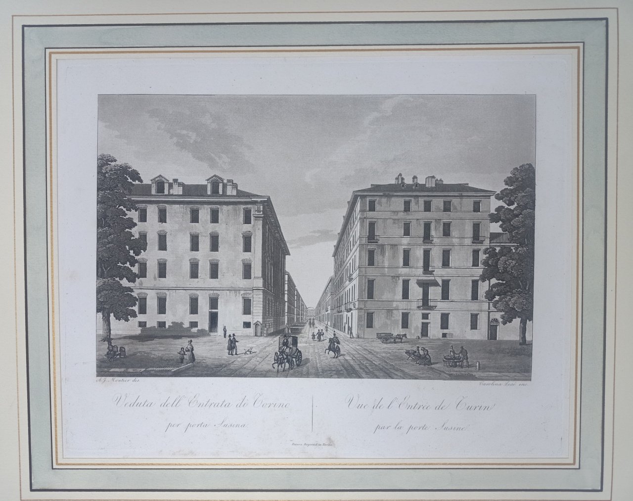 Il titolo della tavola è "Veduta dell'entrata di Torino | per porta Susina", ripetuto a destra in francese "Vue de l'Entrée de Turin | par la Porte Susine". Incisione firmata, di Carolina Losè -sopra il titolo a destra- su disegno di A. J. Moutier -sopra il titolo a sinistra-, con alcune varianti rispetto a quella riprodotta da Peyrot 278/12, da ricercarsi nell'aggiunta di personaggi, cavalli, carrozze e nei dettagli dei palazzi . "Veduta prospettica di via Dora Grossa (attuale via Garibaldi) dall'attuale corso Valdocco verso piazza Castello" (Peyrot, I, 278/12, p. 410).