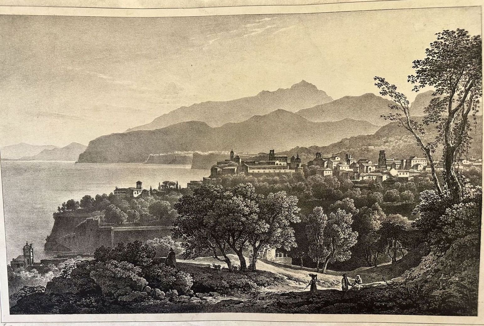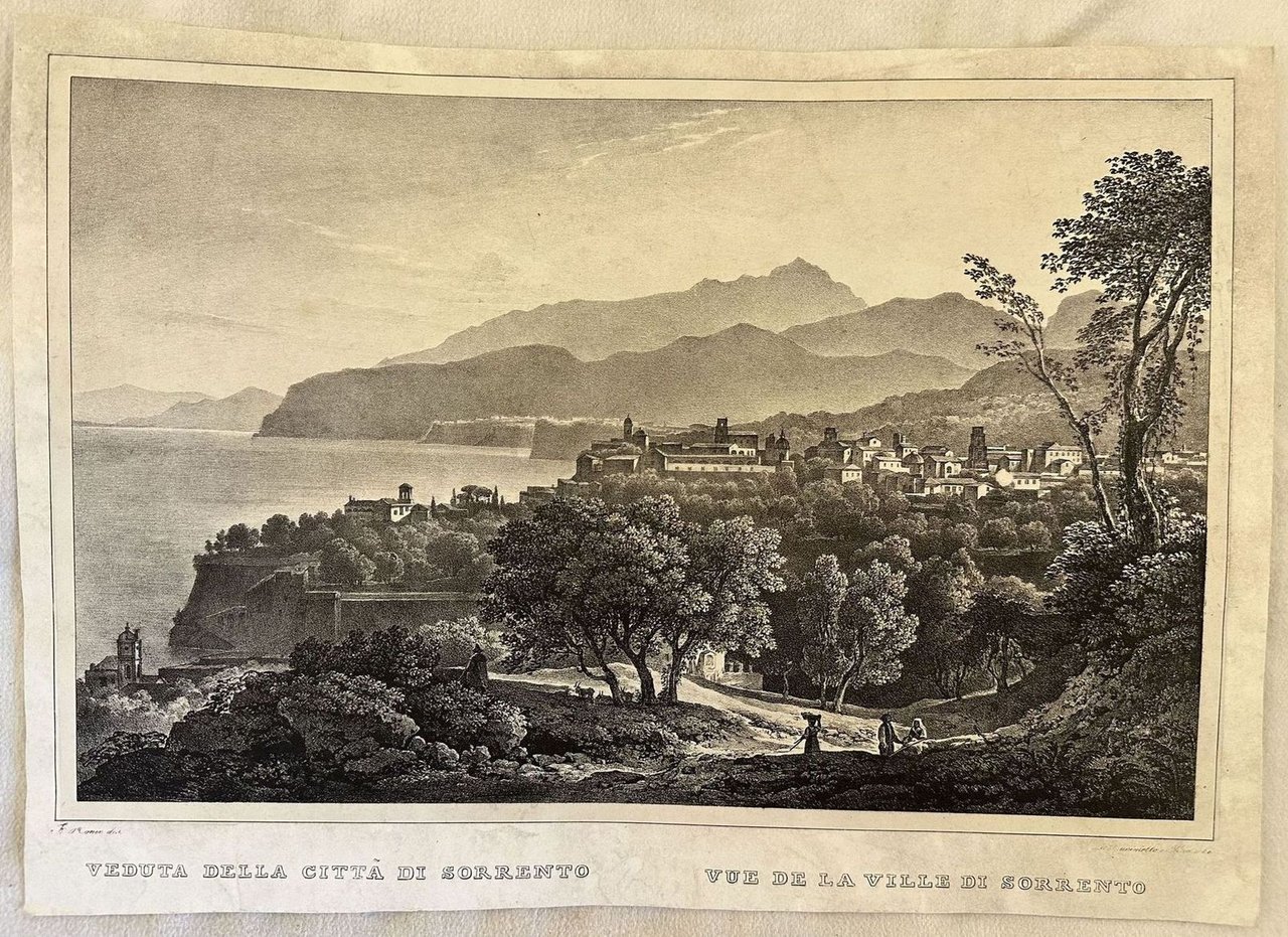 Veduta panoramica animata del 1830 circa della città di Sorrento tratta dall'opera in tre volumi "Viaggio Pittorico nel Regno delle due Sicilie dai ss.ri Cuciniello e Bianchi dedicato a sua Maestà il Re Francesco Primo". Le incisioni vennero eseguite sulla base di disegni della Scuola di Posillipo a quell'epoca ai loro esordi. Atlante: "Viaggio Pittorico nel Regno delle due Sicilie dai ss.ri Cuciniello e Bianchi dedicato a sua Maestà il Re Francesco Primo", S. Anna di Palazzo s.d. Autore: Domenico Cuciniello e Lorenzo Bianchi (Resina, 1780 - Napoli, 1840) Data: 1830-33 circa Tecnica: acquaforte Dimensione del foglio: 345x245 mm Dimensione incisione: 325x235 mm Condizioni: Buone. Rare fioriture. Very fine panoramic animated view of 1830 circa of the city of Sorrento taken form the works in three volumes "Viaggio Pittorico nel Regno delle due Sicilie dai ss.ri Cuciniello e Bianchi dedicato a sua Maestà il Re Francesco Primo". The engravings have been made based on the drawings of the school of Posillipo. Atlas: "Viaggio Pittorico nel Regno delle due Sicilie dai ss.ri Cuciniello e Bianchi dedicato a sua Maestà il Re Francesco Primo", S. Anna di Palazzo s.d. Author: Domenico Cuciniello e Lorenzo Bianchi (Resina, 1780 - Napoli, 1840) Date: 1830-33 circa Technique: etching Leaf Dimension: 345x245 mm Engraving Dimension: 325x235 mm Conditions: Good conditions. Occasional foxing.