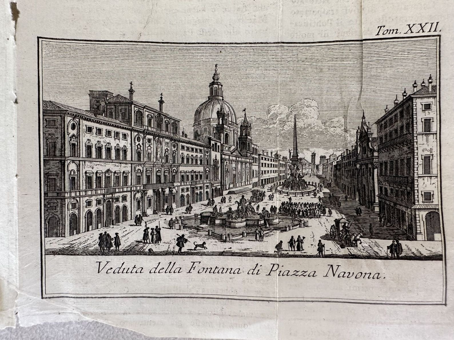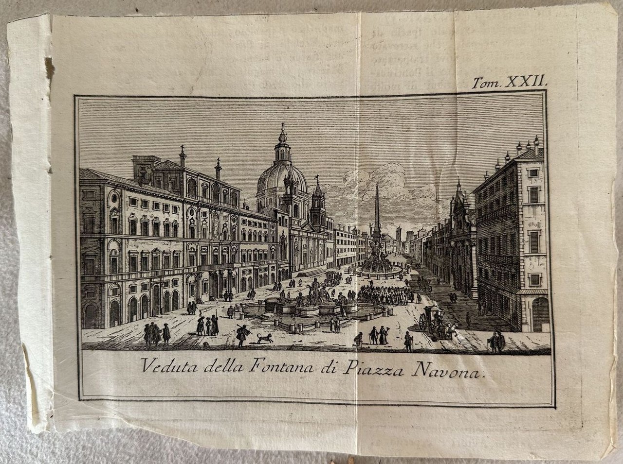 Veduta animata della Fontana di Piazza Navona a Roma. Atlante: Lo stato presente di tutti i popoli del mondo 1738-66 Autore: Thomas Salmon (1679-1767) Data: 1759 Tecnica: incisione su rame Dimensione del foglio: 180x142 mm Dimensione incisione: 153x103 cm Condizioni: Buone. Rare fioriture. Animated view of the Fountain of Piazza Navona in Rome. Atlas: Lo stato presente di tutti i popoli del mondo 1738-66 Autore: Thomas Salmon (1679-1767) Date: 1759 Technique: Copper etching Leaf Dimension: 180x142 mm Engraving Dimension: 153x103 cm Conditions: Good conditions. Occasional foxing. <BR><BR>