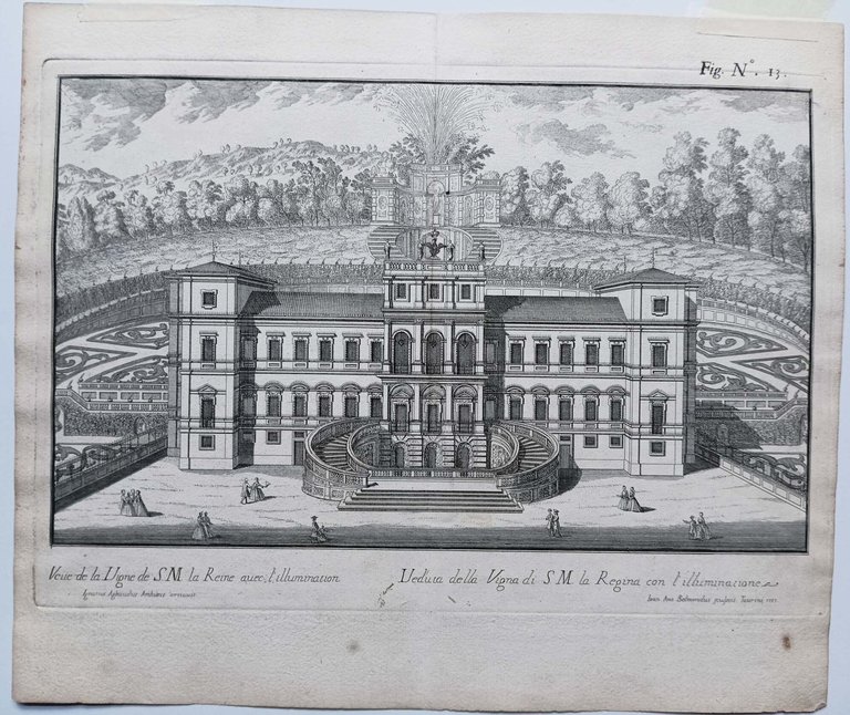 >Incisione originale su rame (mm 285x410 dalla battuta). Lungo il lato inferiore, il titolo a sinistra: "Vue de la Vigne de S.M. la Reine avec Illumination"; a destra: "Veduta della Vigna di S.M. la Regina con l'Illuminazione". Incisione firmata lungo il margine inferiore, a sinistra: Ignatius Agliaudus Architect ornavit .; a destra: Ioan. Ant. Belmondus sculpit. Taurini 1737. In alto, a destra, l'indicazione: Fig. N. 13. Veduta prospettica dell'illuminazione della Villa della Regina, tratta dall'opera: “La sontuosa illuminazione della città di Torino”, pubblicata per l'augusto sposalizio delle Reali Maestà di Carlo Emmanuele Re di Sardegna e della principessa Elisabetta Teresa, che raccoglie 14 tavole a doppia pagina, disegnate e inc. in rame da vari artisti (Vittone, Masson, Agliaudi, Daudet, Belmondo, de Prenner, Herriset), raffiguranti stupende vedute di Torino «illuminata». Bell'esemplare.