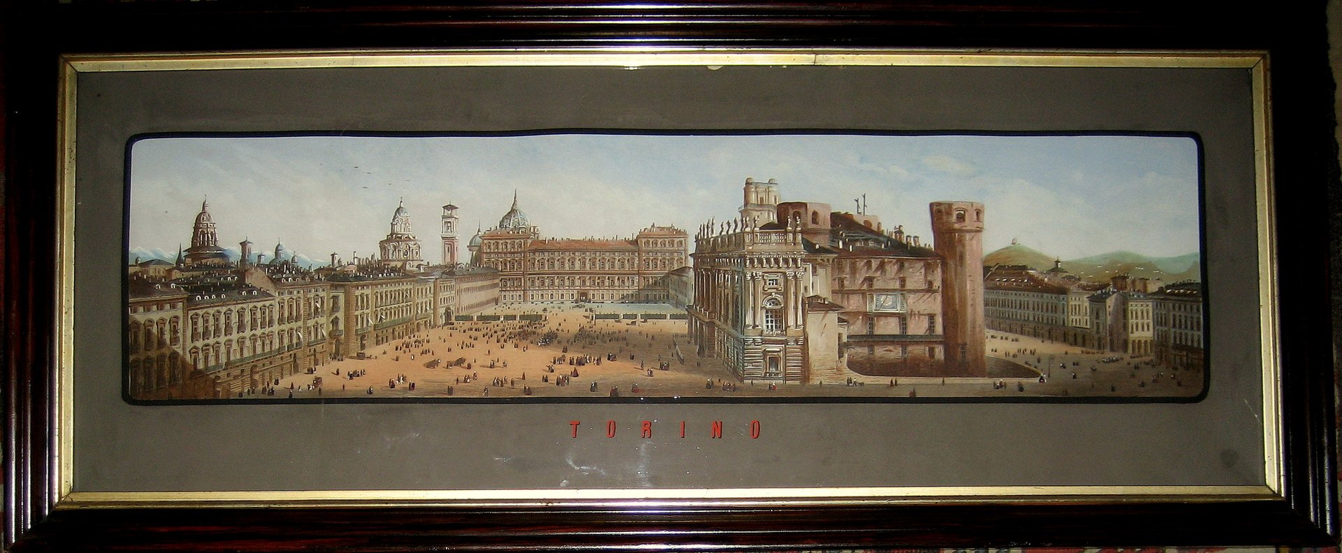 >Incisione in rame (mm 228x900 e ampi margini), con intensa e stupenda colorazione coeva a tempera e acquerello, probabilmente del Bossoli medesimo. Il margine sui quattro lati è dipinto in nero, con la scritta in maiuscole rosse "Torino" al centro di quello inferiore. La coloritura del margine inferiore copre le firme "C. Bossoli dis." a sinistra, "F. Citterio inc." a destra, e degli editori "Ant. Vallardi e Ferd. Artaria". Grandiosa veduta prospettica della piazza, presa a volo d'uccello. E' senza dubbio uno dei capolavori dell'iconografia di Torino ad opera di un grande pittore dell'800. Esemplare in perfetto stato di conservazione, in cornice d'epoca in noce con battuta dorata di circa 1 cm. Assai rara a reperirsi in tali condizioni. Peyrot, Torino nei secoli, vol. II n. 569.