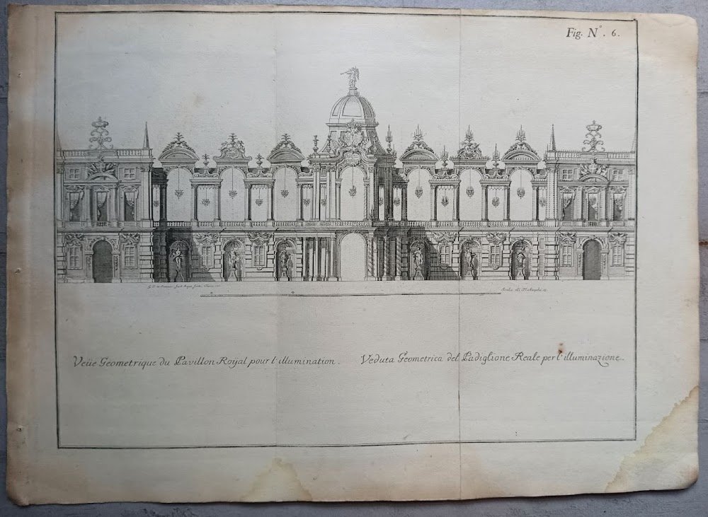 >Incisione originale su rame (mm 345x490 dalla battuta). Lungo il lato inferiore, il titolo, a sinistra: "Vue Geometrique du Pavillon Royal pour l'Illumination", a destra: "Veduta Geometrica del Padiglione Reale per l'Illuminazione". Sopra il titolo, "Scala di Tabucchi 15". In alto a destra l'indicazione "Fig. N. 6". Lungo il lato inferiore, a sinistra: G. C. de Prenner fecit Aqua forte, Turin. 1737. Preospetto del Padiglione di fronte al Palazzo reale con l'illuminazione. Tratta dall'opera: “La sontuosa illuminazione della città di Torino”, pubblicata per l'augusto sposalizio delle Reali Maestà di Carlo Emmanuele Re di Sardegna e della principessa Elisabetta Teresa, che raccoglie 14 tavole a doppia pagina, disegnate e inc. in rame da vari artisti (Vittone, Masson, Agliaudi, Daudet, Belmondo, de Prenner, Herriset), raffiguranti stupende vedute di Torino «illuminata». Macchie di umidità in basso a destra e lungo i margini sinistro e inferiore.