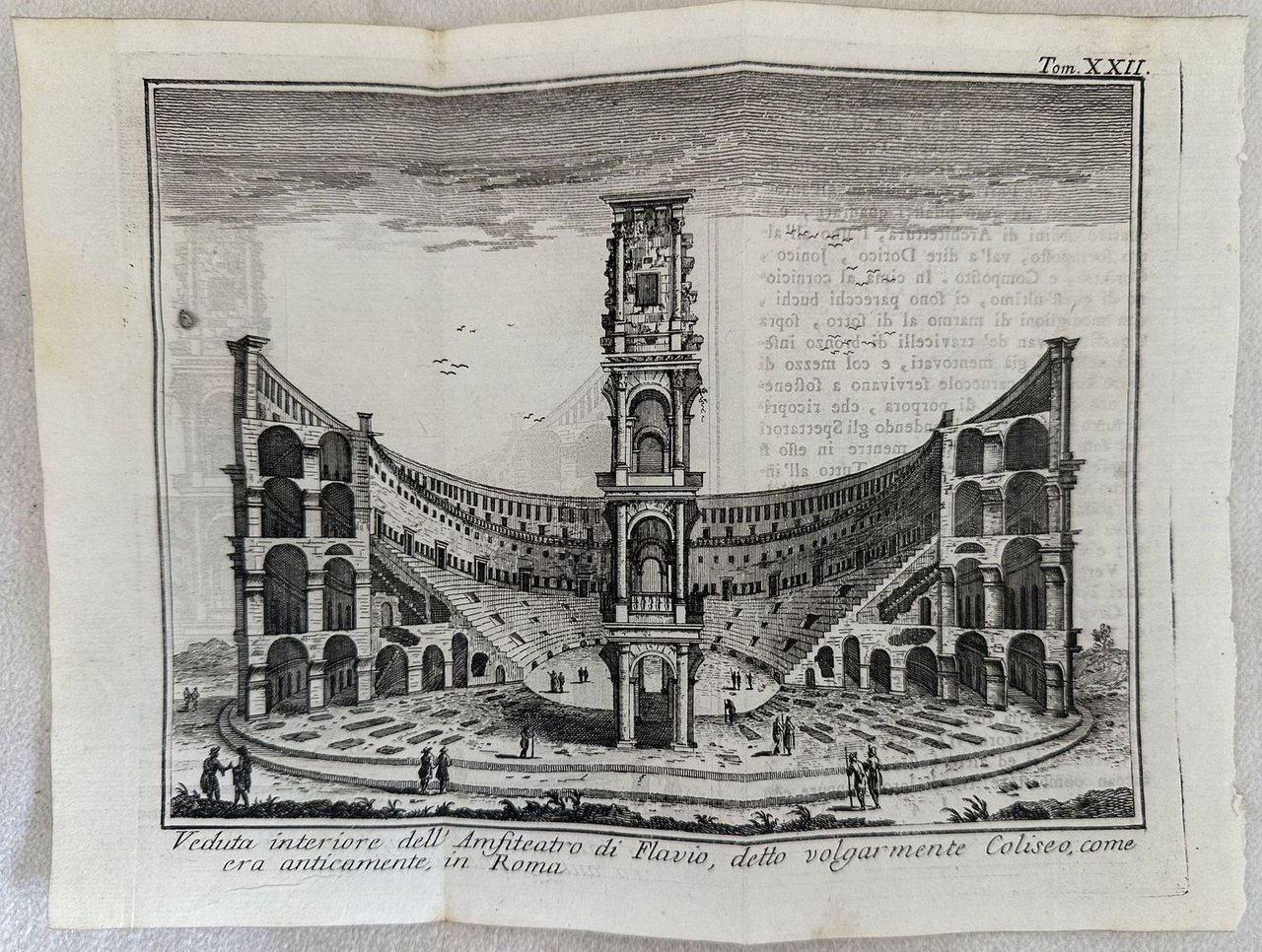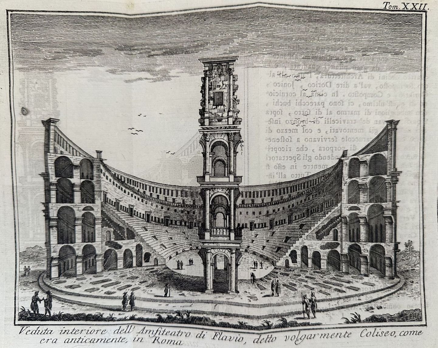 Veduta animata di come si presentava anticamente l'Anfiteatro di Flavio o Colosseo a Roma. Atlante: Lo stato presente di tutti i popoli del mondo 1738-66 Autore: Thomas Salmon (1679-1767) Data: 1759 Tecnica: incisione su rame Dimensione del foglio: 245x185 mm Dimensione incisione: 204x155 cm Condizioni: Buone. Rare fioriture. Animated view of how the Colosseo was in antique time in Rome. Atlas: Lo stato presente di tutti i popoli del mondo 1738-66 Autore: Thomas Salmon (1679-1767) Date: 1759 Technique: Copper etching Leaf Dimension: 245x185 mm Engraving Dimension: 204x155 cm Conditions: Good conditions. Occasional foxing.