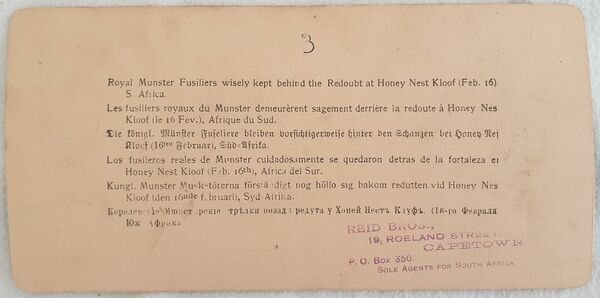 VEDUTA STEREOSCOPICA SECONDA GUERRA BOERA ROYAL MUNSTER FUSILIERS WISELY KEPT BEHIND THE REBOUBT AT HONEY NEST KLOOF (FEB. 16) S. AFRICA
