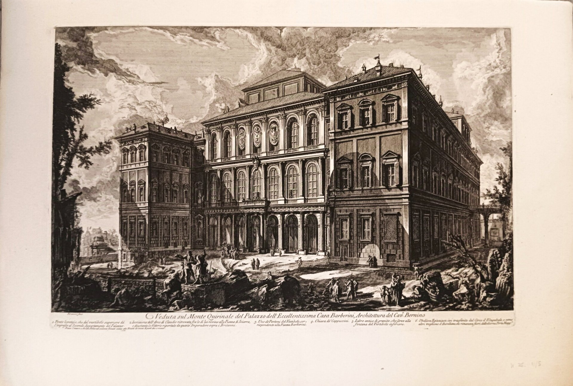 >Acquaforte originale (mm 400x605 ed ampi margini), firmata "Piranesi fece" in basso a sinistra. Titolo inciso nella parte inferiore del rame, in basso su due righe, la legenda: 1. Ponte levatoio, che dal vestibolo superiore dà/ l'ingresso al Secondo Appartemento del Palazzo/ 2. Iscrizione dell'Arco di Claudio ritrovata fra le di lui rovine alla Piazza Sciarra/ e dinotante le Vittorie riportate da questo Imperatore sopra i Britanni/ 3. Uno de' Portoni del Vestibolo, cor/ rispondente alla Piazza Barberini/ 4. Chiesa de' Cappuccini/ 5. Labro antico di granito, che serve alla/ fontana del Vestibolo inferiore/ 6. Obelisco Egizziaco, ivi trasferito dal Circo d'Elogabolo, o come/ altri vogliono d'Aureliano, che rimaneva fuori dell'odierna Porta Magg.e . Sullo sfondo il palazzo del Quirinale, in primo piano numerosi personaggi animano la scena.