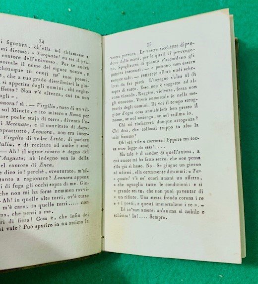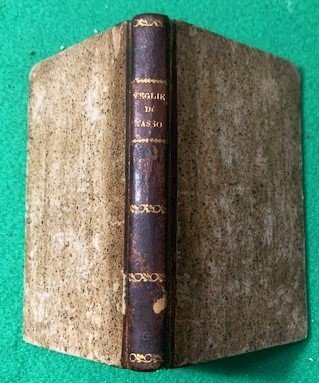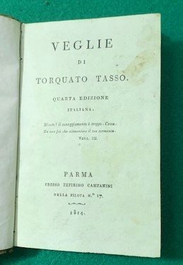 In 12°; 108 pp. e una c. di tav. fuori testo a piena pagina. Legatura coeva in mezza-pelle scura con titolo e fregi in oro impressi al dorso. Piatti foderati con bella carta coeva colore caffè. Tagli spruzzati in rosso. Rarissimo esemplare stampato su carta azzurra di grande qualità. Esemplare in ottime condizioni di conservazione. Quarta rara edizione, fra le più rare fra quelle di questo titolo, la prima edizione ucì a Milano nel 1803, di questo celebre impostura del noto costituzionalista, letterato e giornalista romagnolo, Marco Giuseppe Compagnoni (Lugo di Romagna in provincia di Ravenna, 3 marzo 1754 Milano, 29 dicembre 1833) cosiderato il padre del tricolore italiano. Il nome dell'autore, Giuseppe Compagnoni, si ricava da: La raccolta tassiana n. 1497. A p. 3: "Prefazione del Signor Compagnoni alla prima edizione italiana". A p. 9: "Memorie storiche sopra Torquato Tasso scritte dall'editore per la intelligenza delle veglie". Scrive Giuseppe Gullino, nella voce dedicata a Compagnoni, nel Dizionario Biografico degli Italiani, Treccani, Volume 27 (1982): "Poi venne Marengo, rinacque la Cisalpina. Scrive il C.: "Per avere qualche soldo onde . ritornare in Italia pensai di scrivere una operetta la quale . potesse avere fortuna presso i Francesi. Scelsi il nome del Tasso, il più conosciuto tra i nostri grandi poeti". Comparvero così le Veglie del Tasso, che persino i traduttori Mimaut e Ginguené considerarono un documento autentico dell'infelice passione del poeta per Eleonora d'Este. L'"impostura innocente" ebbe il merito di risolvere tutto a un tratto i problemi del suo autore: il libro ebbe infatti grande fortuna e fu più volte ristampato anche in tedesco, russo, polacco. Tornato a Milano, rifiutò la cattedra di economia politica dell'università di Pavia per dedicarsi ad un progetto di pubblica istruzione nel quale suggeriva di imprimere il massimo sviluppo alle scuole popolari, riducendo lo studio del latino e rafforzando il controllo ideologico dello Stato sul personale docente e sugli allievi. Il piano, forse a causa della sua impostazione troppo avanzata, non venne però approvato, ed al C. fu invece conferita la nomina a promotore della Pubblica Istruzione ed Educazione, sorta di ispettore generale didattico-amministrativo del sistema scolastico cisalpino. Nella pratica, tuttavia, la sua azione fu vanificata dalla mancanza di idonee strutture operative e si ridusse all'espletamento di formalità burocratiche, come la celebrazione ufficiale della pace di Lunéville (9 febbr. 1801). Egli fece poi parte della commissione istituita per vagliare i reclami fiscali, quindi fu eletto deputato del Basso Po ai Comizi di Lione, ma rifiutò per suggerimento del Costabili, che ne conosceva i tiepidi sentimenti verso il Melzi d'Eril. Fu tuttavia proprio il Melzi - al quale, il 21 apr. 1802, il C. aveva opportunamente indirizzato un piano intitolato Considerazioni sulle relazioni politico-diplomatiche della Repubblica Italiana, in cui venivano esposte la situazione della Repubblica e le sue relazioni internazionali, e si raccomandava lo sviluppo dell'esercito e dell'istruzione pubblica, le due grandi forze sulle quali doveva poggiare uno Stato nazionale - a nominarlo segretario del Consiglio legislativo (31 genn. 1803), carica che avrebbe ricoperto ininterrottamente fino al 1810, sia pure con la diversa denominazione di segretario del Consiglio di Stato, allorché venne creato il Regno italico". Assai Raro. Rif. Bibl.: IT\ICCU\LO1E\001808.