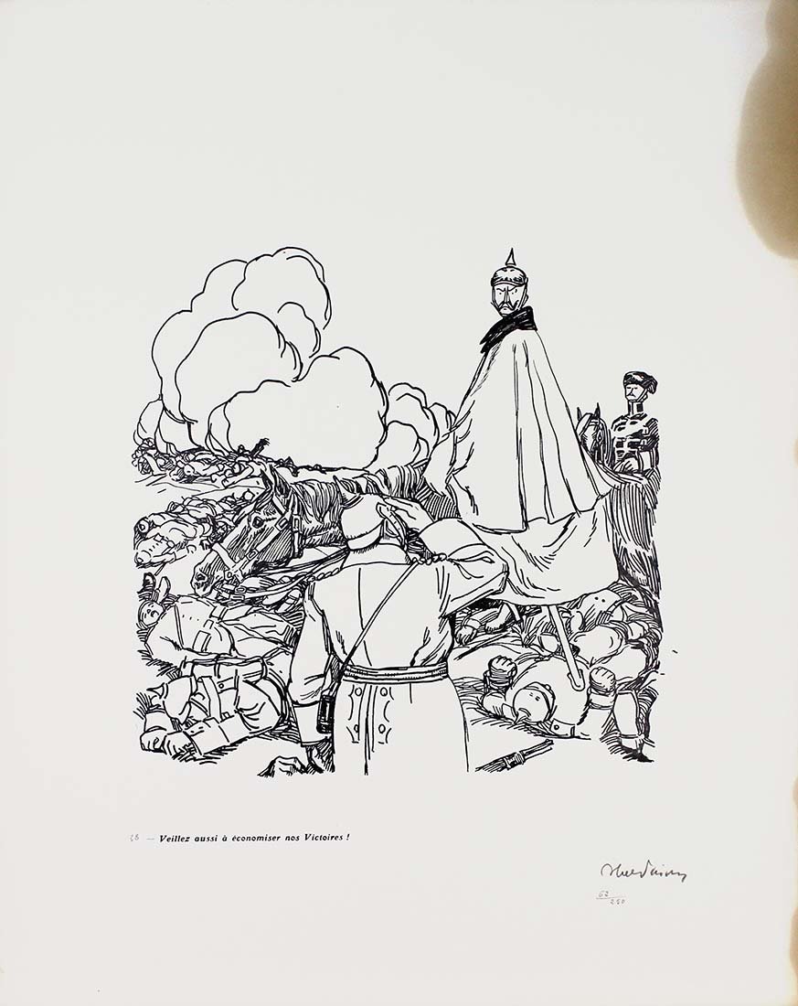 Abel Jules Faivre (Lione 1867 - Nizza 1945) Litografia originale firmata a mano dall'artista.Dimensioni: 56 x 38,5 cmCon certificato di autenticità C.O.A.Ingiallimento laterale come da foto.Esemplare numero 62/250 La raccolta di litografie umoristiche del caricaturista francese Abel Faivre (Lione 1867-Nizza 1945), andata a confluire nel volume Jours de guerre,fu pubblicata in due tomi tra il 1915 e il 1919. Con il procedere del conflitto, l'opinione pubblica di tutti i paesi coinvolti,che aveva dapprima affrontato tale evento con ottimismo, mutò rapidamente opinione sino a considerare la guerra, senza mezzi termini,come un avvenimento rovinoso. In tale contesto, le vignette satiriche di guerra possedevano un potente effetto catartico,adempivano un ruolo sociale irrinunciabile, fornendo una valvola di sfogo all’incombere dal più cupo pessimismo. Abel Jules Faivre (Lyon 1867 - Nizza 1945) Originale Lithographie vom Künstler von Hand signiert.Abmessungen: 56 x 38,5 cmMit Echtheitszertifikat C.O.A.Seitliche Vergilbung wie auf dem Foto.Kopieren Sie die Nummer 62/250 Die Sammlung humorvoller Lithographien des französischen Karikaturisten Abel Faivre (Lyon 1867-Nizza 1945), die in den Band Jours de guerre floss,es wurde zwischen 1915 und 1919 in zwei Bänden veröffentlicht. Im Verlauf des Konflikts wurde die öffentliche Meinung in allen beteiligten LändernWer dieses Ereignis anfangs mit Optimismus konfrontiert hatte, änderte schnell seine Meinung, um den Krieg ohne Zweifel zu betrachten.wie ein ruinöses Ereignis. In diesem Zusammenhang hatten die satirischen Kriegskarikaturen eine starke kathartische Wirkung.Sie erfüllten eine unverzichtbare soziale Rolle und bildeten ein Entlastungsventil gegen den dunkelsten Pessimismus. Abel Jules Faivre (Lyon 1867 - Nice 1945) Lithographie originale signée à la main par l'artiste.Dimensions: 56 x 38,5 cmAvec certificat d'authenticité C.O.A.Jaunissement latéral comme sur la photo.Copie numéro 62/250 La collection de lithographies humoristiques du caricaturiste français Abel Faivre (Lyon 1867-Nice 1945), qui allait se fondre dans le volume Jours de guerre,il a été publié en deux volumes entre 1915 et 1919. À mesure que le conflit progressait, l'opinion publique de tous les pays impliqués,qui avait d'abord fait face à cet événement avec optimisme, a rapidement changé d'avis pour envisager la guerre, en termes non équivoques,comme un événement ruineux. Dans ce contexte, les caricatures de guerre satiriques ont eu un puissant effet cathartique,ils remplissaient un rôle social indispensable, fournissant une soupape de décharge du pessimisme le plus sombre. Abel Jules Faivre (Lyon 1867 - Nice 1945) Original lithograph signed by hand by the artist.Dimensions: 56 x 38.5 cmWith certificate of authenticity C.O.A.Lateral yellowing as in the photo.Copy number 62/250 The collection of humorous lithographs by the French caricaturist Abel Faivre (Lyon 1867-Nice 1945), which went to flow into the volume Jours de guerre,it was published in two volumes between 1915 and 1919. As the conflict progressed, public opinion in all the countries involved,who had initially faced this event with optimism, quickly changed his opinion to consider the war, in no uncertain terms,like a ruinous event. In this context, the satirical war cartoons had a powerful cathartic effect,they fulfilled an indispensable social role, providing a relief valve from the darkest pessimism.