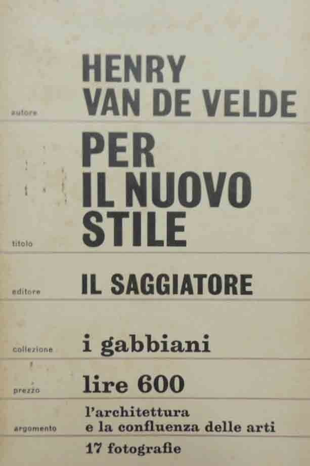 Henry van de Velde, Per il nuovo stile, a cura di Hans Curjel, traduzione di Maria Attardo Magrini, Casa Editrice Il Saggiatore, Milano 1966, pp. 253, 3 c. di tavv. f.t. ill. b.n., cm 17, br. ed. Collana I gabbiani, n. 36. Titolo: Zum neun stil. Leggere tracce d’uso alla brossura, minime fioriture, per il resto ben conservato.