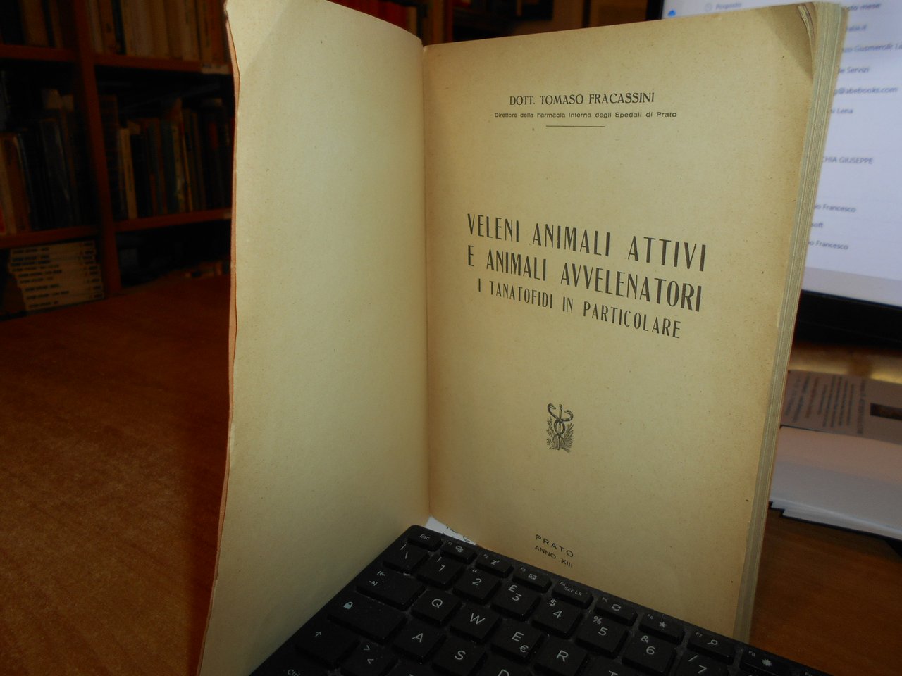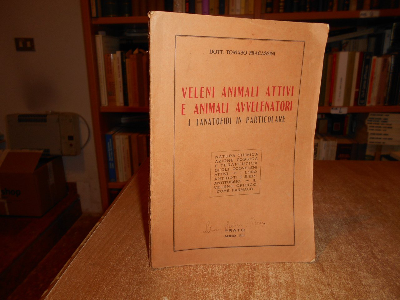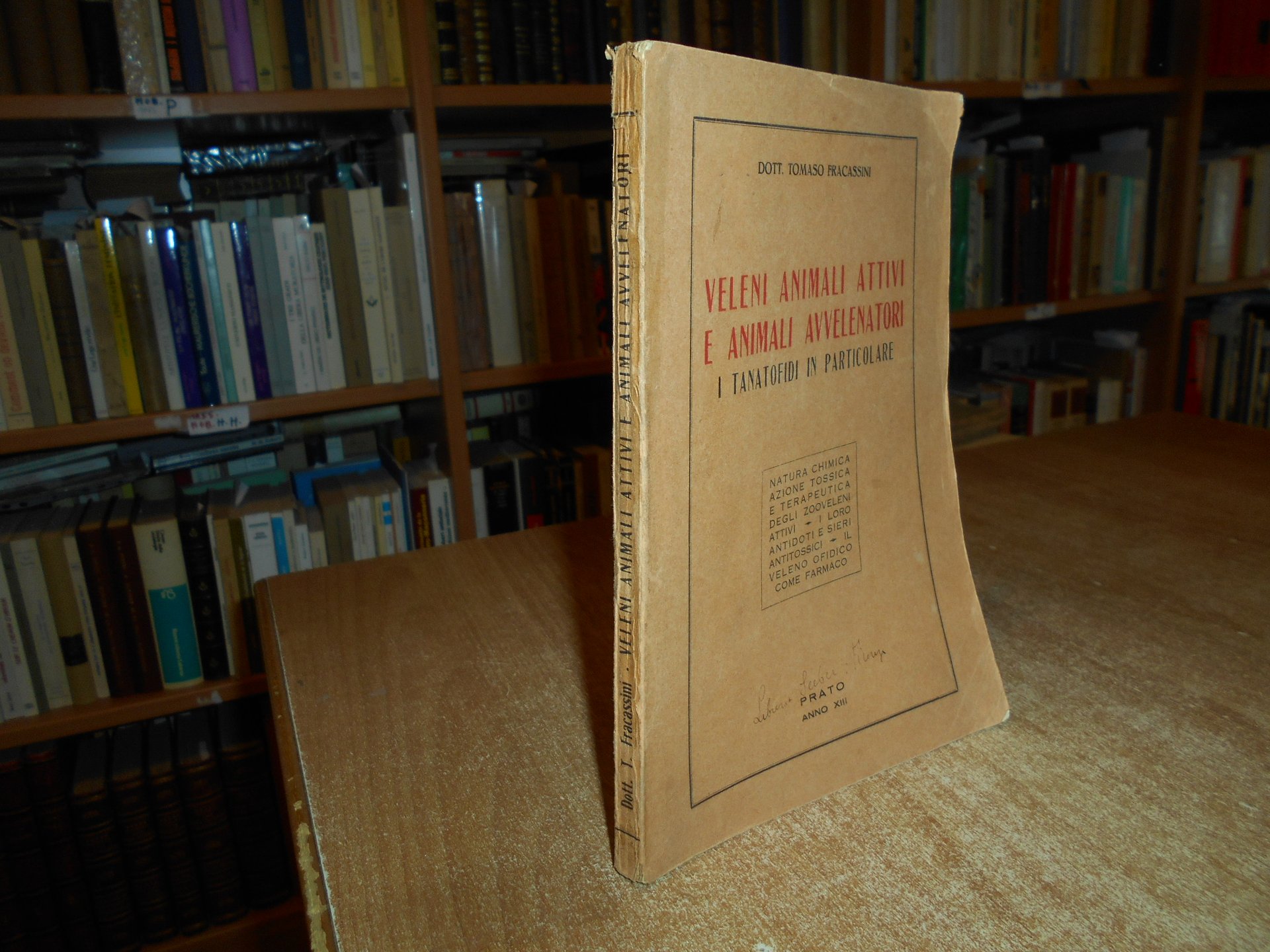 TOMASO FRACASSINI. Prato, Stab. Tipografico G. Bechi, 1934. Veleni Animali Attivi e Animali Avvelenatori. In-8°, br. orig. (5), 180, (12) pp. Normali segni d' uso ma ben conservato. Neg. med. mob. G entro busta trasp.