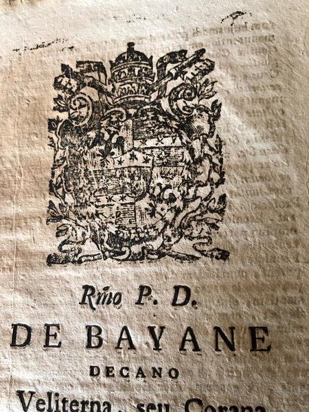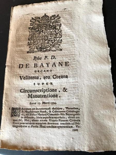 Placchetta giuridica in folio (cm 20 x 29), di cc (2), pagina iniziale sormontata da grande stemma papale di Pio VI silografico, riguardante la causa ereditaria concernente il fondo 'La Casella', tra Teresa e Maddalena Nardi e Gaetano Colazingari, nella città di Cori.