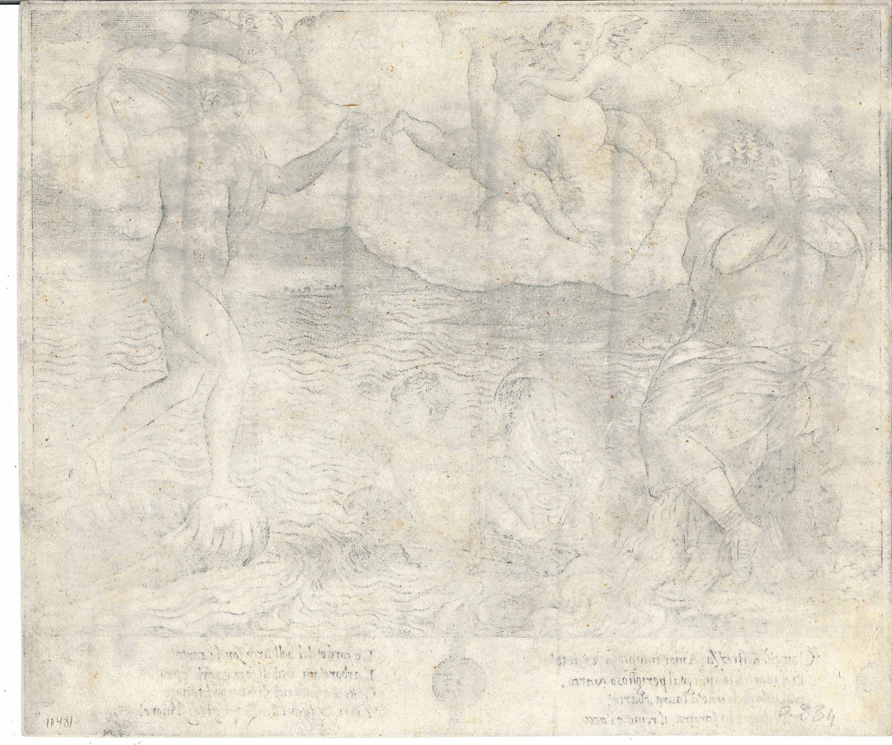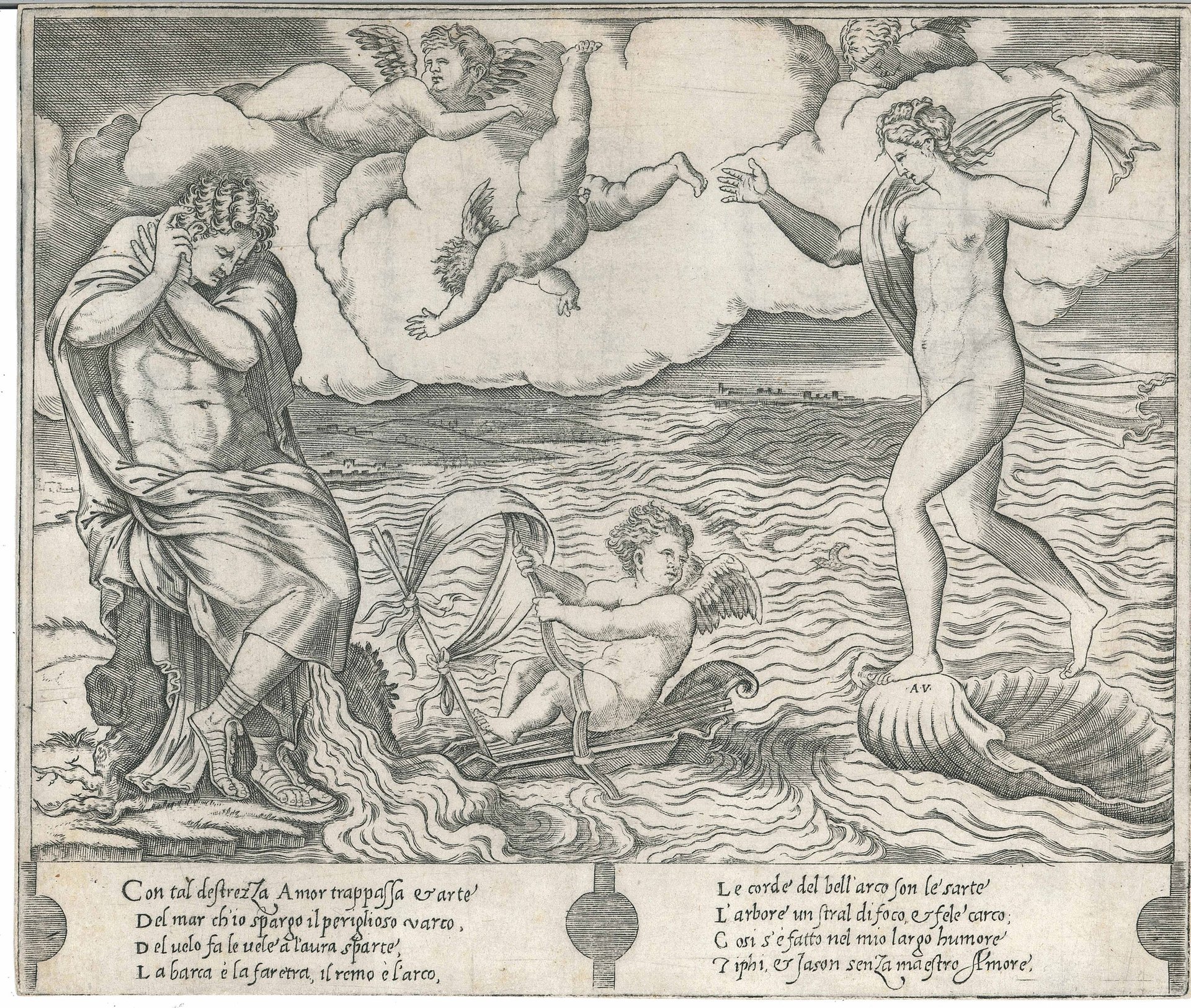 >Incisione originale a bulino mm 197x227, monogrammata "A.V" sulla conchiglia che regge Venere, rimandando a Botticelli. Bella prova, nitida con tonalità argentee, I stato di 2, antecedente all'indirizzo del Salamanca, impressa su carta filigrana Ancora nel cerchio con stella, databile intorno ai primi decenni del Cinquecento. Lungo il margine inferiore su due cartigli il testo: "Con tal destrezza Amor trapassa e Arte / Del mar che io spargo il periglioso varco /...Le corde del bell'arco son le sarte....Cosi s'è fatto nel mio largo humore / Tiphi et Jason senza maestro Amore". Esemplare completo dei due riquadri di filetti.