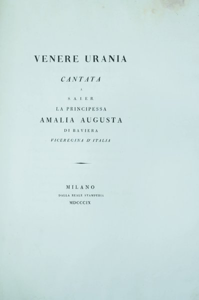 In folio gr. (mm. 452x306), cartoncino muto stile Ottocento, pp.nn. 8. "Edizione originale" nella rara tiratura in folio su carta velina forte.Il Monti diede mano alla cantata Venere Urania, consacrata ai regnanti, per accompagnare il dono del disegno allegorico che celebrava la "Scuola di Leonardo", offerto dal Cav. Giuseppe Bossi alla Vice Regina Amalia il 15 dicembre 1809, quando ella si degnò di recarsi a osservare la copia del Cenacolo dal medesimo eseguita ed esposta nel Reale Palazzo delle Scienze e delle Arti in Milano (Brera). Sconosciuta al Bustico in questo formato. Bell'esemplare con barbe, a grandi margini.