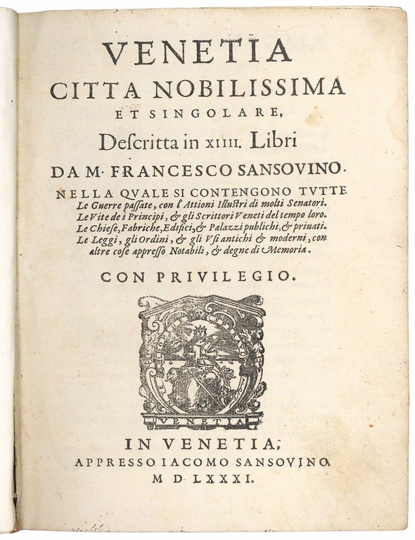 Venetia città nobilissima et singolare, Descritta in XIIII Libri [...] Nella quale si contengono tutte le Guerre passate, con l'Attioni illustri di molti Senatori. Le Vite de i Principi, et gli Scrittori Veneti del tempo loro. Le Chiese, Fabriche, Edifici, et Palazzi publichi, et privati. Le Leggi, gli Ordini, et gli Usi antichi et moderni, con altre cose appresso Notabili, et degne di Memoria