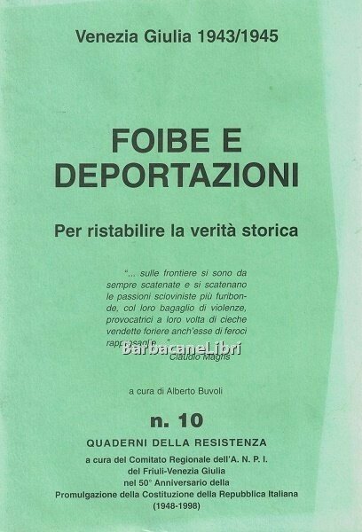 Stato di conservazione: BUONO, parte della copertina sbiadita, lievissimo alone di umidità ai margini delle prime pagine, errore di impaginazione (numerazione sbagliata delle pagine segnalata da errata corrige, ma il testo è completo). Collana: Quaderni della Resistenza. Pubblicazione edita a cura del Comitato Regionale dell'ANPI del Friuli-Venezia Giulia. Introduzione di Arturo Calabria, Silvano Bacicchi, Federico Vincenti. Testi di Giuseppe Lorenzon, Alberto Buvoli, Galliano Fogar, Mario Pacor, Giovanni Miccoli, Geoffrey Cox, Elio Apih, Raoul Pupo