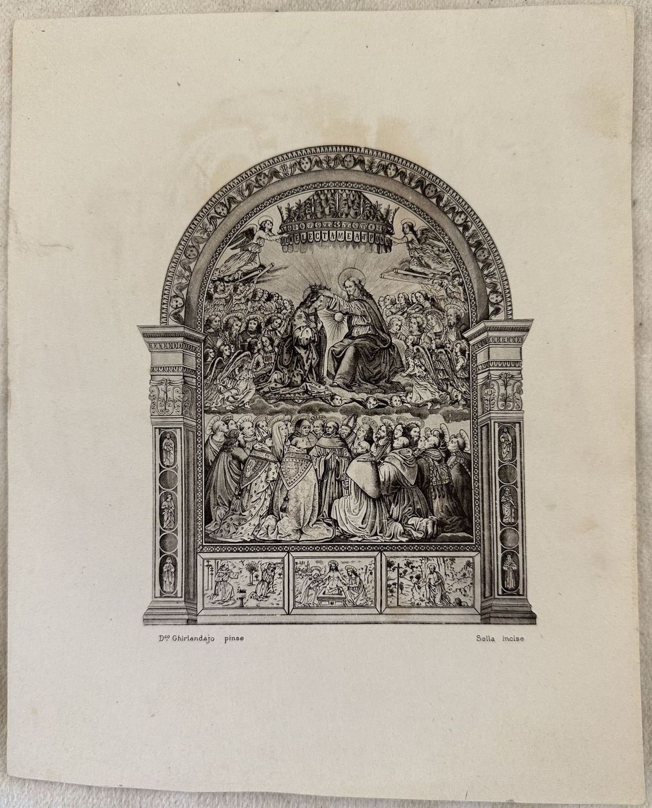 Bella incisione all'acquaforte che rappresenta un dipinto di Domenico Ghirlandaio inciso da Sella. Autore: Sella su dipinto di Domenico Ghirlandaio Data: 1840 circa Tecnica: acquaforte Dimensione del foglio: 20,5x16,5 cm Dimensione incisione: 13x10,5 cm Condizioni: Buone. Alcune fioriture. Segni di colla al versoBeautiful etching engraving representing a painting Domenico Ghirlandaio engraved by Sella. Author: Sella after painting Domenico Ghirlandaio Date: 1840 circa Technique: etching engraving Page size:20,5x16,5 cm Engraving size: 13x10,5 cm Conditions: Good conditions. Some foxing. Glue sign in the verso
