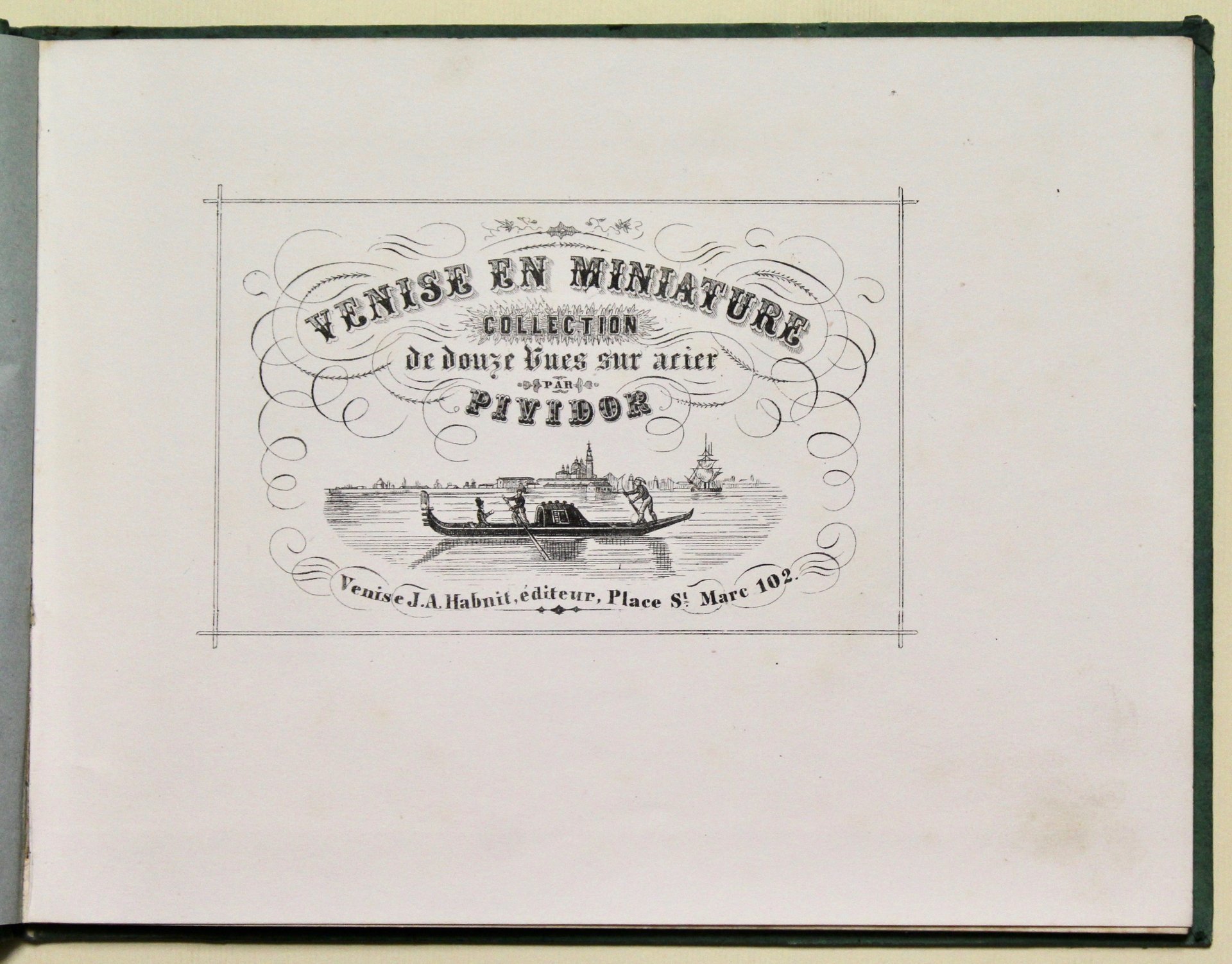 In 12° oblungo (mm 160x200). Non commune raccolta in album delle più suggestive vedute della città. Frontespizio inciso in silografia con bella vedutina di Venezia sullo sfondo e una gondola in primo piano e 12 bellissime tavole incise in acciaio su carta forte con ampi margini, dipinte da G. Pividor e incise da Lloyd Austriaco. Cartoncino editoriale verde a stampa con veduta di venezia al piatto superiore. Minime fioriture marginali saltuarie. Ottimo esemplare.