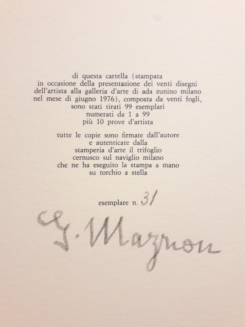 4 pp. non numerate con una poesia inedita in facsimile. 20 tavole sciolte, perfette riproduzioni dei disegni dell'artista. Cartella e cofanetto. Tiratura di 99 + X esemplari (ns. 31). Firma dell'autore al colofon.