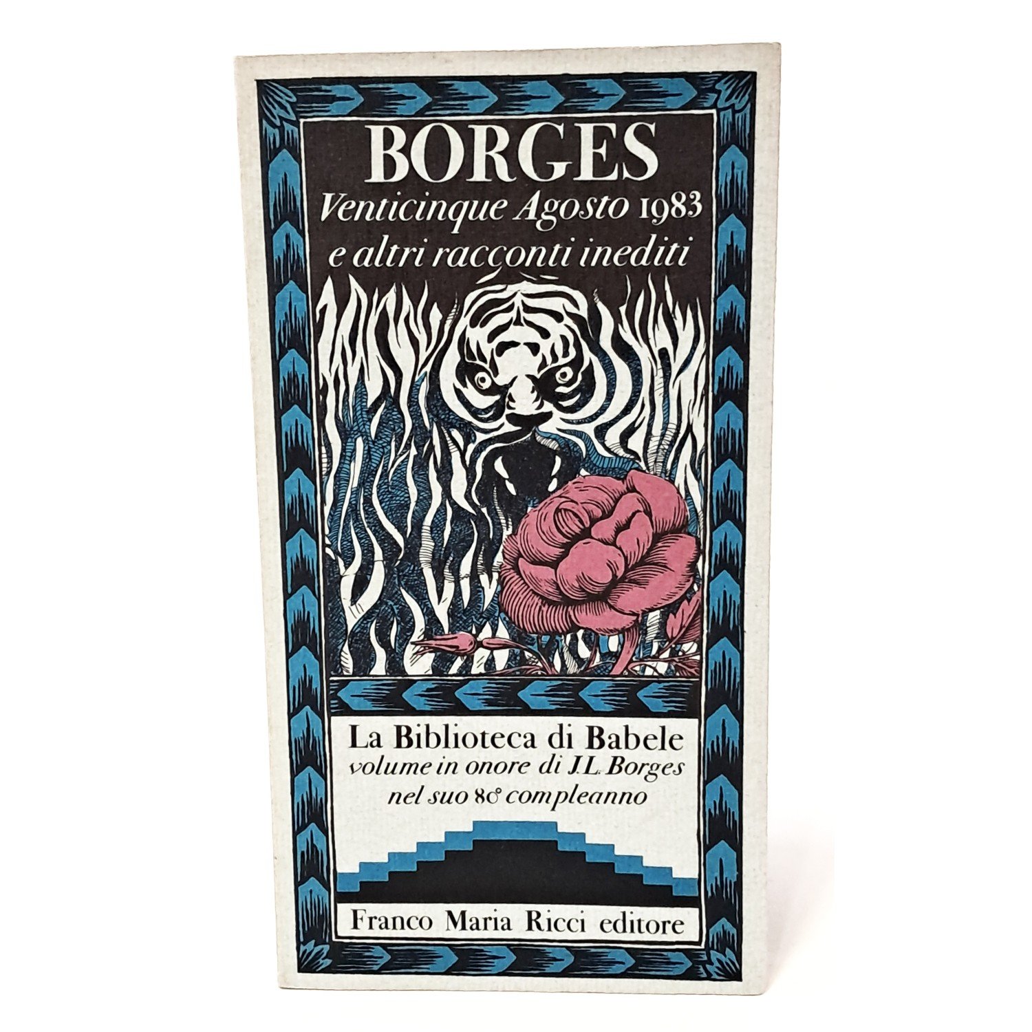 PRIMA EDIZIONE nella collana La biblioteca di Babele curata diretta da Borges, collana di letture fantastiche. Volume realizzato in onore di Borges per il suo 80° compleanno. Una raccolta di racconti di Jorge Luis Borges, quasi tutti inediti al momento della pubblicazione, arricchita da un’intervista di María Esther Vázquez e una cronologia dettagliata della vita e dell’opera di Borges. Brossura. Pp. 147. Caratteri bodoniani.