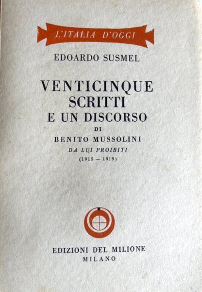 Il volume pubblica il testo di 25 scritti e di un discorso di Mussolini esclusi dall'Edizione Adriatica per sua espressa volontà. In appendice l'elenco (e relativo contenuto) dei volumi inediti dell'Edizione Adriatica, l'elenco completo degli scritti esclusi dall'Edizione Adriatica e l'elenco degli articoli firmati "Il popolo d'Italia". Premessa di Duilio Susmel. Prima (e unica) edizione di 1305 esemplari numerati.