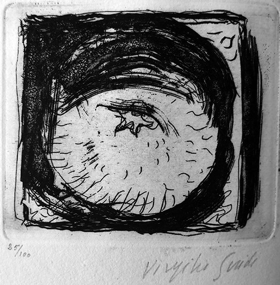 8°; pp. 36 non num. 6 su carta a mano filigranata Fabriano con barbe; con cinque acqueforti f.testo num. e firmate a matita dal Maestro. Brochure edit. con titoli al piatto, bel ex-libris d'appartenenza. Edizione tirata a 100 esempl. numerati oltre a XX num. romana. Cfr. Jentsch.<BR>(vedi riproduz.)