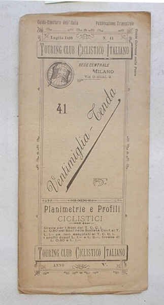Tavola di 10 facciate di cm. 21 x 8 (perciò lunga cm. 80 circa). VG. ** Le "Planimetrie e profili ciclistici" del Touring Club Ciclistico Italiano sono una collezione di pubblicazioni che ha qualcosa, anzi è più esatto dire molto! di epico: i 57 itinerari, pubblicati in 51 fascicoli tra il 1896 e il 1901, Luigi Vittorio Bertarelli, il fondatore del T.C.I., se li è fatti tutti in bicicletta, appuntando ogni informazione utile su un taccuino. Ogni itinerario è descritto su una lunga tavola, che si svolge orizzontalmente e che è ripiegata in una copertina con titoli, fregi e piccolo stemma del T.C.C.I. La tavola presenta un profilo altimetrico a tre colori e la cartina dell'area, con il tracciato evidenziato in rosso. Il profilo, oltre alle quote, contiene l'indicazione delle distante, della qualità delle strade (polverose, discrete, buone.), delle tappe e altre notizie utili (sorgenti, "splendido panorama", hotel, ristoranti, servizi postali.).