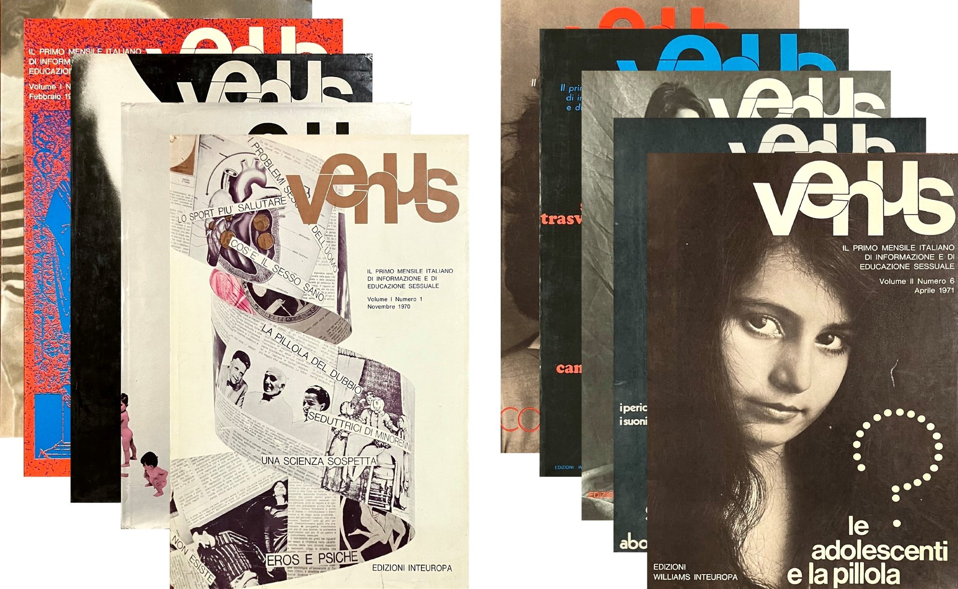 L'editoriale a firma del direttore spiega la scelta del nome: "Venus" come simbolo dell'amore, del sesso, della fecondità, dell'erotismo, nell'arte e nella scienza. Con un ricco apparato iconografico e una bellissma veste grafica, la rivista immortala uno sguardo alla sessualità ancora laico, scientifico e soprattutto digiuno del pensiero "politically correct": ad esempio il cambiamento di sesso era ancora considerato rischioso, ed anzi vietato sui transessuali perché considerato una mutilazione di organi genitali integri! Primi tre numeri in cartonato con sovraccoperta, i successivi in brossura, numerazione delle pagine progressiva, redatta in collaborazione con la rivista "Sexuology" di New York. Timbro di appartenenza al risguardo anteriore dei primi tre numeri, qualche minimo difetto alle sovraccoperte dei primi 3 numeri, altrimenti ottimi esemplari.