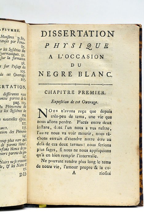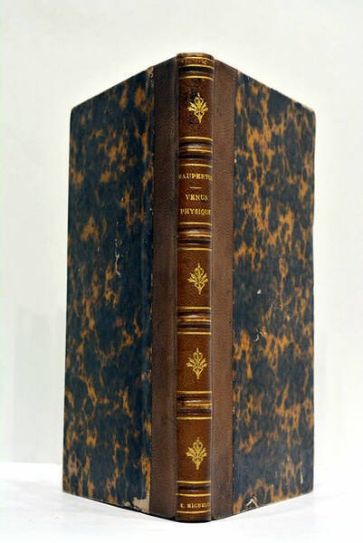 4 feuillets. 168 pages. (16,5x11 Cm). Demi chagrin tabac. Dos à nerfs orné. Tranches rouges. Reliure du XIXe s. Coins et coiffes émoussés. Plats un peu frottés. Dissertations de Maupertuis sur l'hérédité. La 'Dissertation Physique à l'occasion du Nègre Blanc', qui occupe la première partie du volume contient également d'importantes contributions à la théorie génétique. Dans Vénus physique, Maupertuis s’oppose en 1745 à la théorie de la préformation de l’embryon alors en vogue, en affirmant que le père et la mère ont une influence égale sur l’hérédité. Il tente d’expliquer les phénomènes génétiques par une théorie d’attraction physico-chimique. Le volume contient deux dissertations, l’une intitulée Sur l’origine des animaux, l’autre, Variétés dans l’espece humaine. La Dissertation Physique à l’occasion du Nègre Blanc avait été publiée séparément l’année précédente et contient également d’importantes contributions à la science de l'hérédité. Maupertuis y affirme, avec raison, que la couleur blanche du nègre est une anomalie héréditaire. Petits manques sur les trois premiers feuillets. Rousseurs. Déchirure sans manque de texte page 39/40.