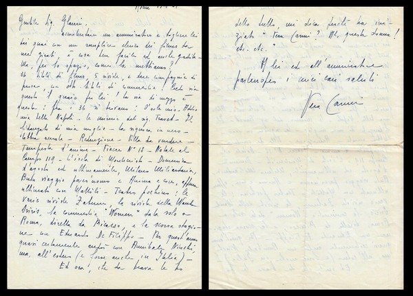 Vera Carmi, pseudonimo di Virginia Doglioli. (Torino, 1914 – Roma, 1969). Attrice italiana. Lettera manoscritta e firmata.