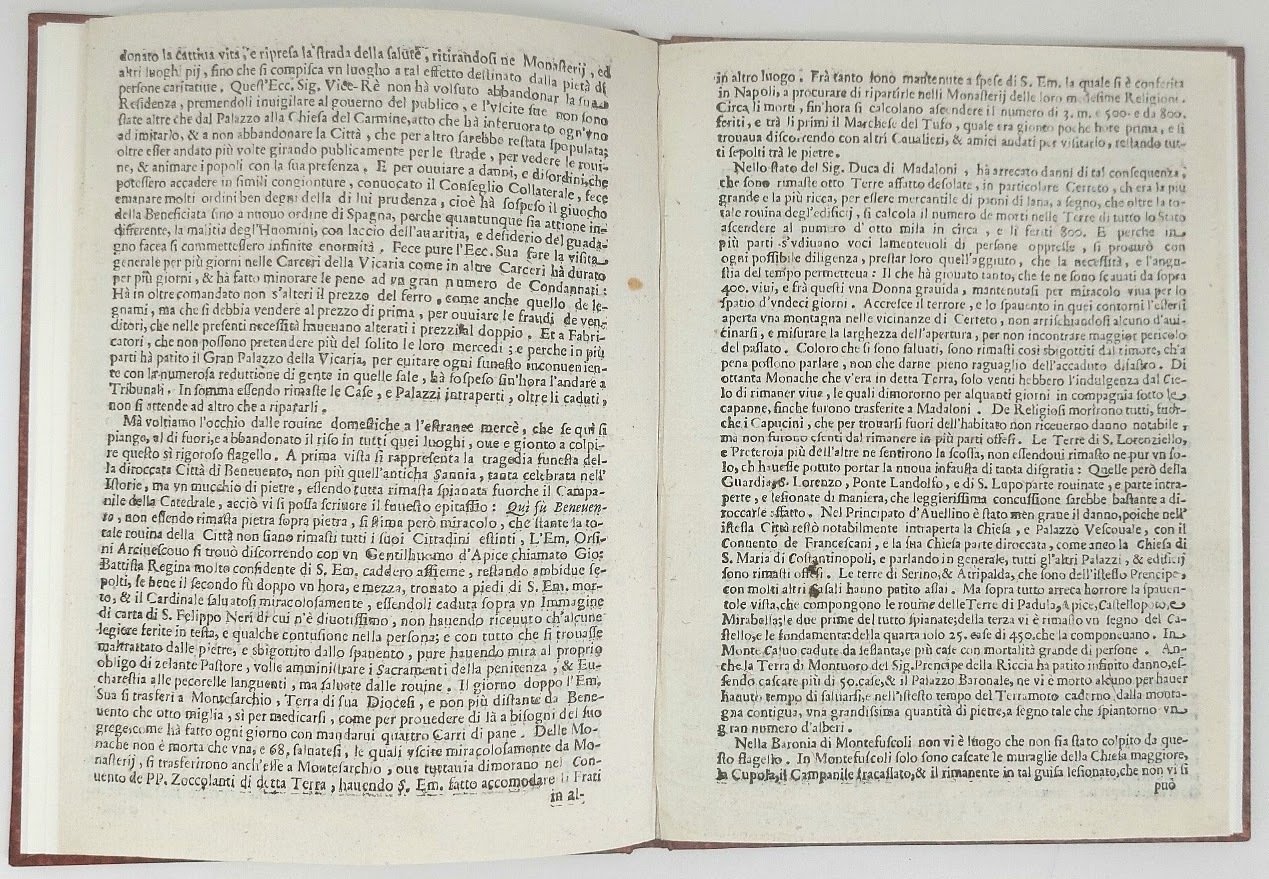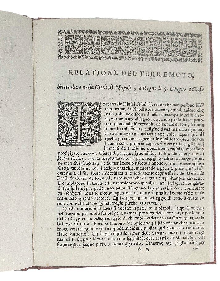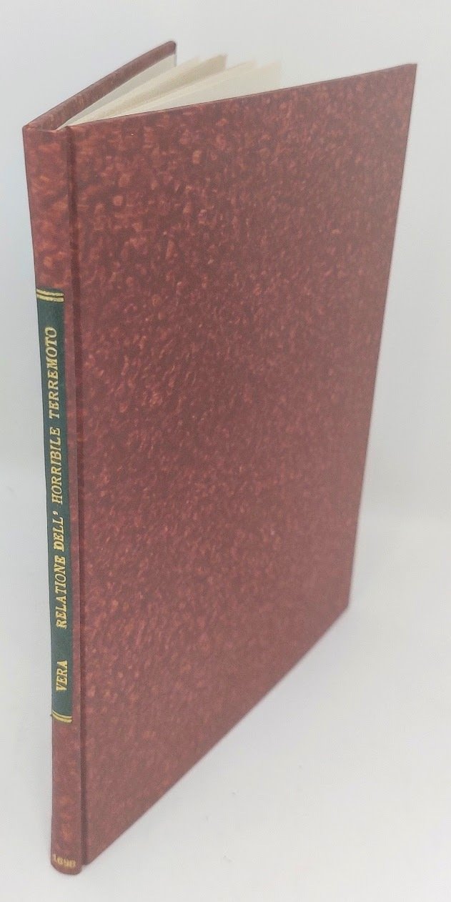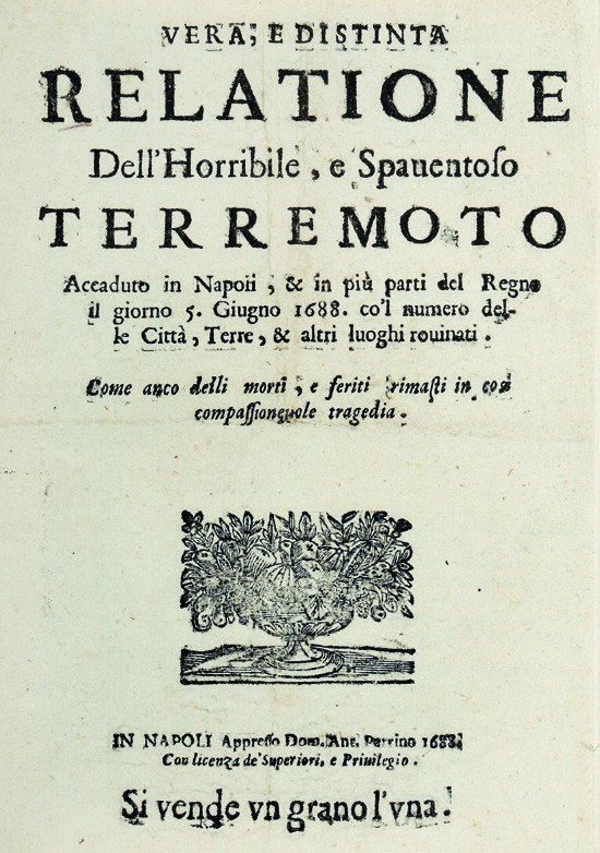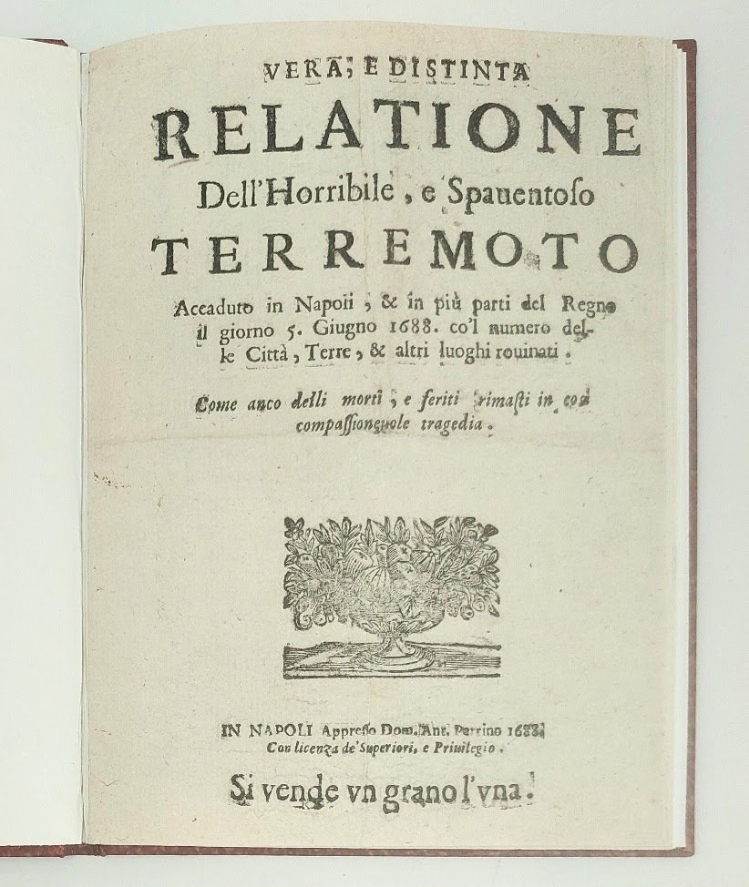 >In-8 (202x146 mm) pp. (8), vignetta al titolo, frontalino ed elaborata capolettera; legatura in cartonato posteriore, titolo oro su tassello al dorso. Raro resoconto narrativo di uno dei più violenti terremoti storici avvenuti a Napoli, pubblicato poco dopo l'evento “spaventoso e terribile” del 5 giugno 1688 e scritto dallo stesso stampatore, Domenico Antonio Parrino. “Il terremoto colpì Napoli nelle prime ore della sera, quando molte persone passeggiavano nella zona del porto alla ricerca di aria fresca. Numerosi edifici della città furono distrutti; la chiesa di San Paolo Maggiore perse la maggior parte della sua facciata [...] la cupola del Gesù Nuovo, la principale chiesa dei gesuiti, fu rovinata [...] Il terremoto del 1688, secondo la convinzione diffusa, fu una punizione di Dio per i peccati di Napoli, e un ricordo grafico dei modi misteriosi in cui la Provvidenza si prende cura di noi” (H. S. Stone, Vico's Cultural History, p. 9). Sul titolo è impresso il prezzo dell'opuscolo, “Si vende un grano l'uno”. Una traduzione inglese di questo breve racconto fu stampata a Londra nel 1688. Sconosciuto a Baratta. Alcune macchiette, nel complesso l'esemplare si presenta in eccellente stato di conservazione. BSRI, p. 287, CP034; H. S. Stone, Vico’s Cultural History. The Production and Transmission of Ideas in Naples, 1685-1750, New York-Köln 1997, pp. 9-12.