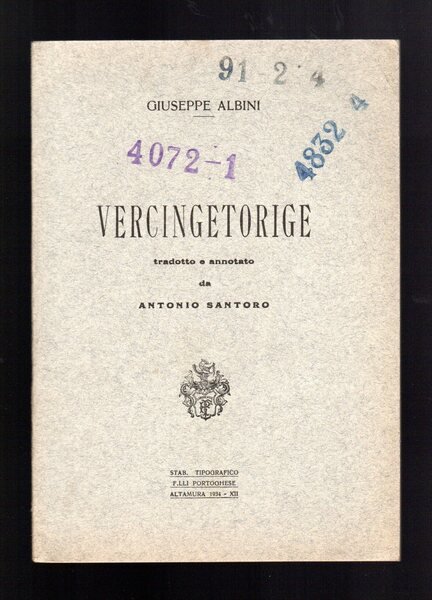 Opuscolo vintage. Poema latino premiato con medaglia d'oro nel concorso poetico Hoeufftiano nel 1919 (Certamen poeticum Hoeufftianum di Amsterdam). Ritratto in bn all'antiporta. Traduzione di Antonio Santoro. Timbri in copertina. Usura da scaffale. Ordinario segno del tempo.